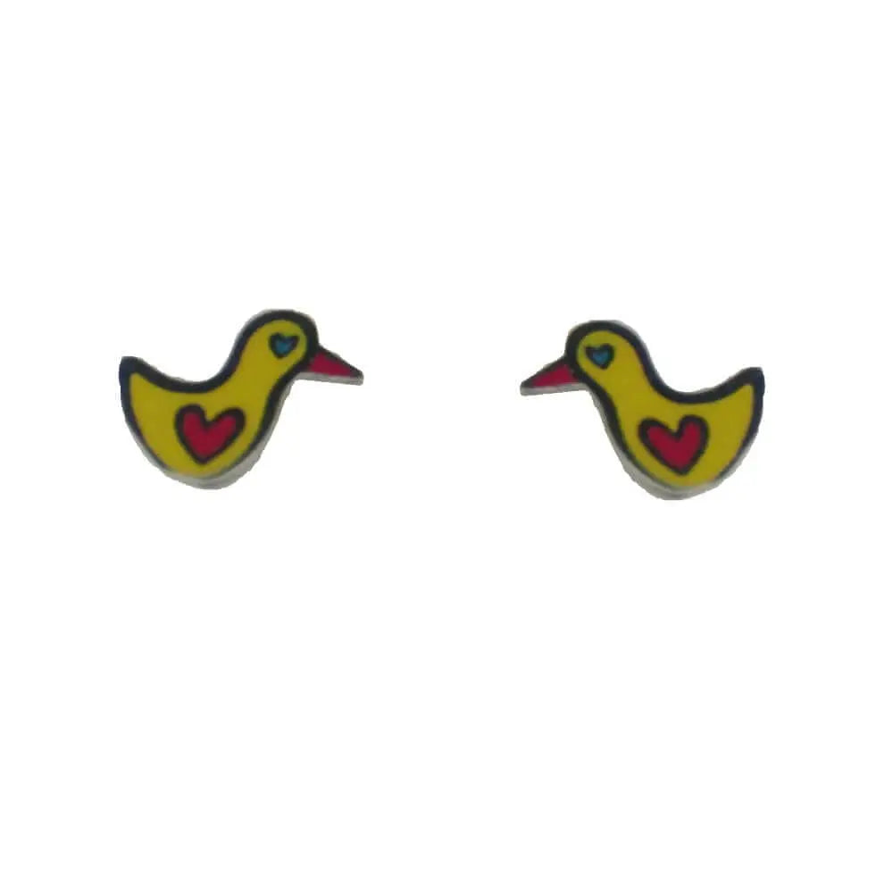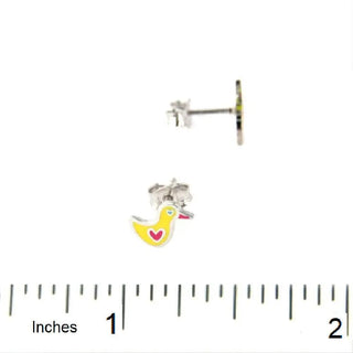 Pendientes de botón de pájaro pequeño amarillo con esmalte y corazón rojo de esmalte en plata de ley