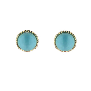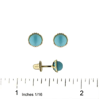 Cada pendiente presenta una cautivadora cuenta de pasta de turquesa de 0,16 pulgadas (4 mm), enmarcada en un elegante engaste que resalta su tono vibrante. Los pendientes están fabricados en oro amarillo macizo hipoalergénico de 18K, libres de níquel y plomo, garantizando seguridad y comodidad para pieles sensibles.