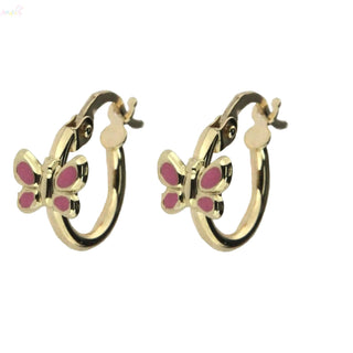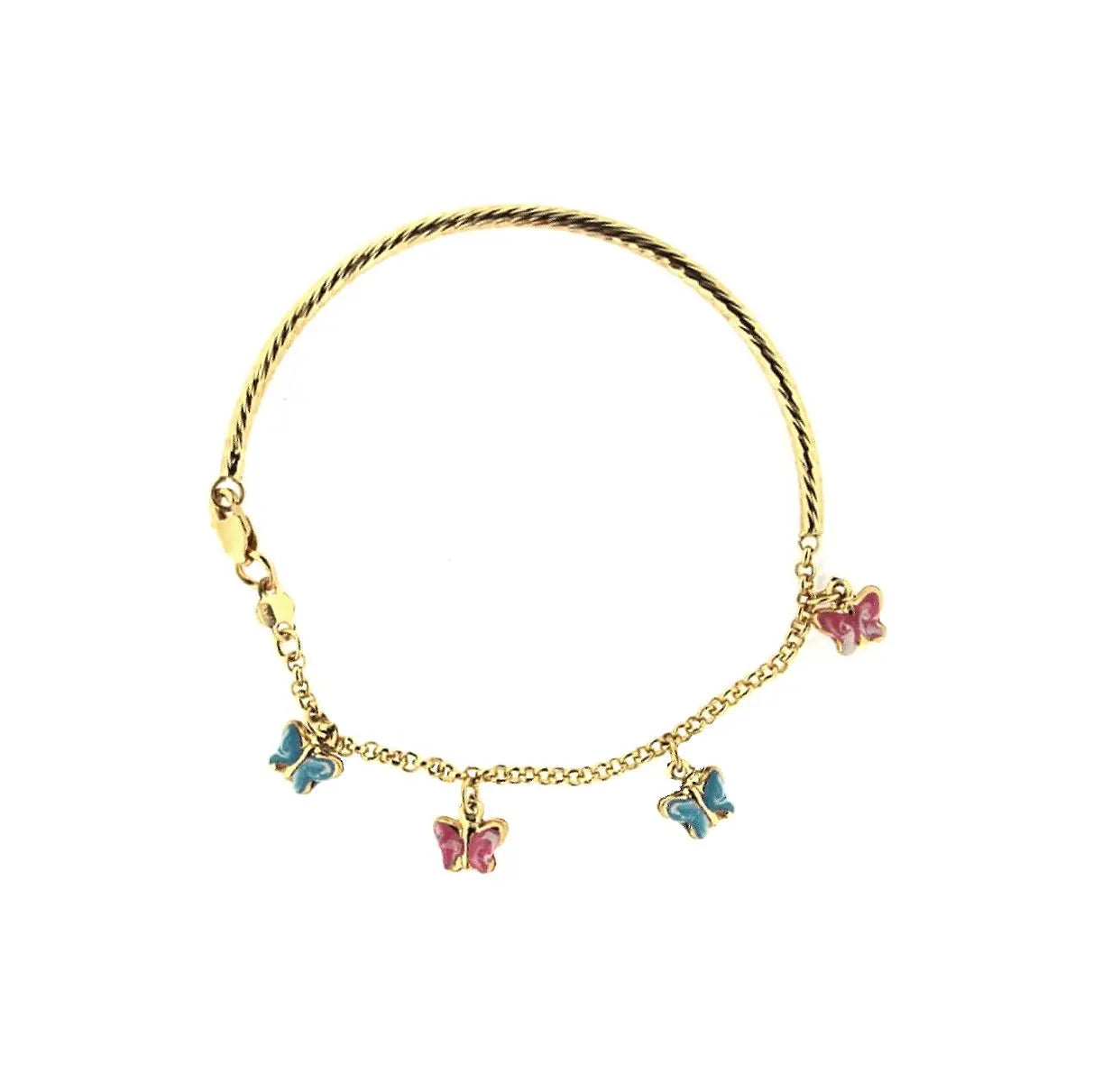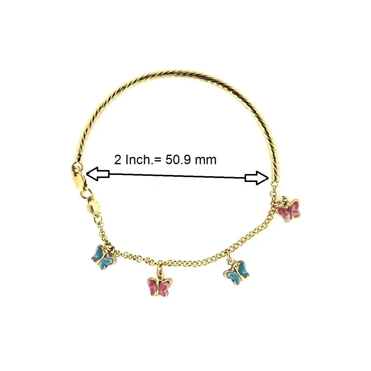 Apportez une touche de fantaisie et de couleur à la garde-robe de votre petit avec le bracelet demi-jonc papillon en émail en or jaune massif 18 carats. Conçu spécialement pour les enfants, ce bracelet enchanteur présente un charmant papillon suspendu en émail tourbillonnant rose et bleu qui ajoute une élégance ludique à toute tenue. Le bracelet comprend un demi-jonc tubulaire de 2 pouces de diamètre et une chaîne de 2,75 pouces, pour une longueur totale de 4,75 pouces, s'adaptant parfaitement aux enfants de 0 à 5 ans avec un ajustement sûr et confortable.