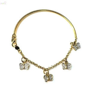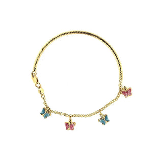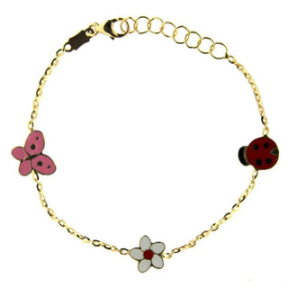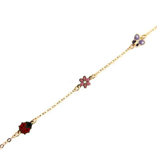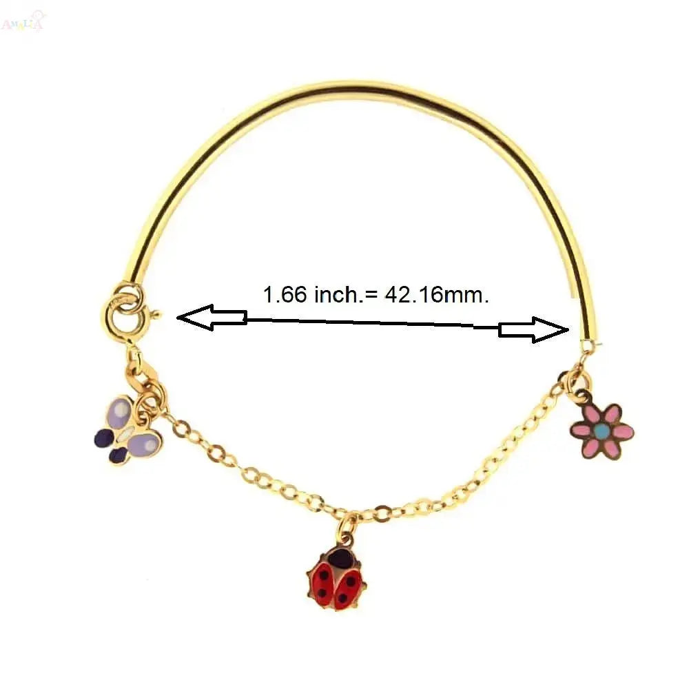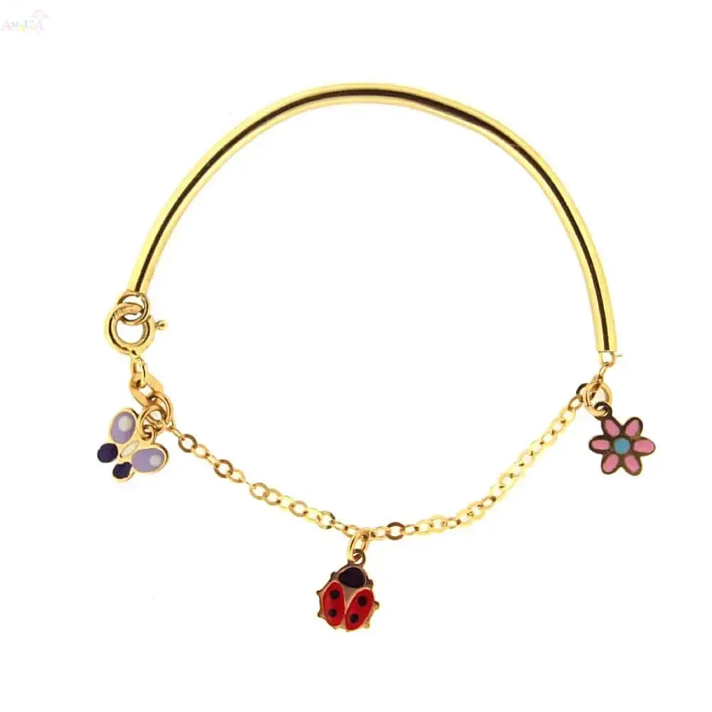 Offrez une touche d'enchantement avec le bracelet demi-jonc 18 carats en or avec fleur, papillon et coccinelle, idéal pour les nouveau-nés jusqu'à 3 ans. Fabriqué avec expertise en Italie, ce bracelet hypoallergénique, sans plomb ni nickel, est en or jaune massif 18 carats, garantissant qu'il est sûr et confortable pour les tout-petits.