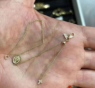 Découvrez le bracelet réglable en or jaune massif 18 carats Médaille Miraculeuse et Petite Croix en Zirconia, un mélange magistral de foi et de mode. Doté d'un système réglable innovant, ce bracelet offre une facilité de port et une polyvalence inégalée, s'adaptant confortablement à tout poignet jusqu'à 20 cm. L'élégante Médaille Miraculeuse symbolise la grâce et la protection, magnifiquement complétée par une étincelante Petite Croix en Zirconia qui pend délicatement du système réglable, ajoutant une touche luxueuse à cette pièce spirituelle. Chaque bracelet est élégamment présenté dans une boîte cadeau Amalia avec un sac, garantissant une expérience de déballage mémorable. Que ce soit pour une occasion spéciale ou comme expression sincère de dévotion, ce magnifique bracelet est le cadeau parfait, capturant des sentiments profonds et mettant en valeur un goût impeccable pour la haute joaillerie. Sa facilité de port, combinée à son symbolisme significatif, en fait non seulement un bijou mais un souvenir précieux.