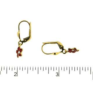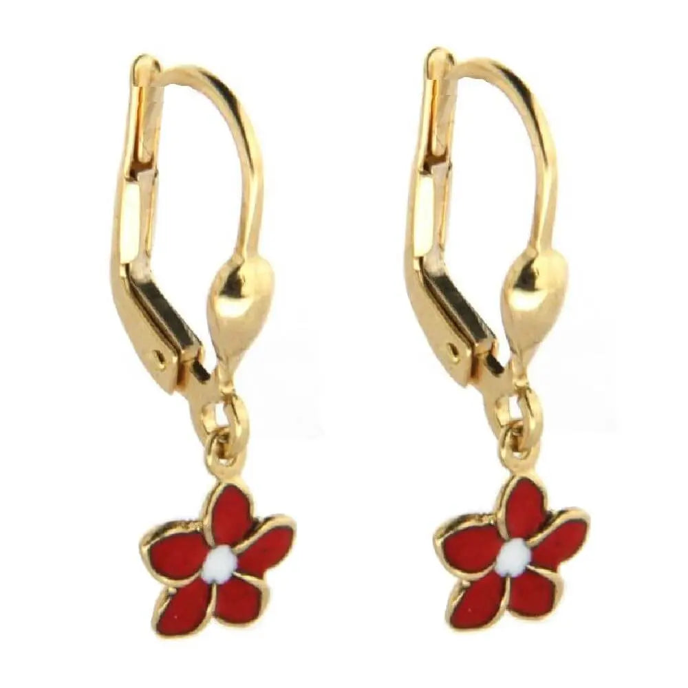 Boucles d'oreilles à levier en or jaune 18 carats avec fleur en émail rouge