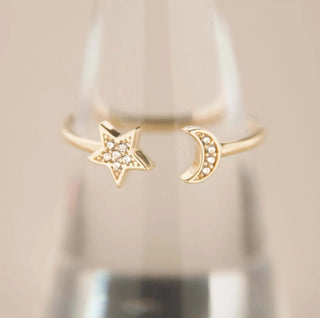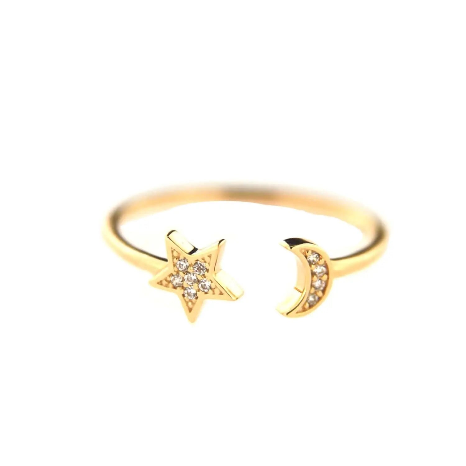 Bague ouverte étoile et lune en zircon en or jaune massif 18 carats, ajustable d'un demi-taille