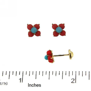 Discover the ideal present with our stunning 18K Gold Coral and Turquoise Flower Screwback Earrings. These earrings, measuring a delicate 0.20 x 0.20 inches (5 x 5 mm), are perfectly sized for newborns to girls up to 7 years old. Crafted from hypoallergenic 18K solid yellow gold, which is both lead and nickel free, they offer safety and elegance in one.
