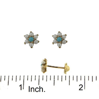 18K Gold Small Pearls Turquoise Flower Screwback Earrings