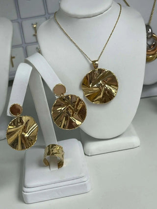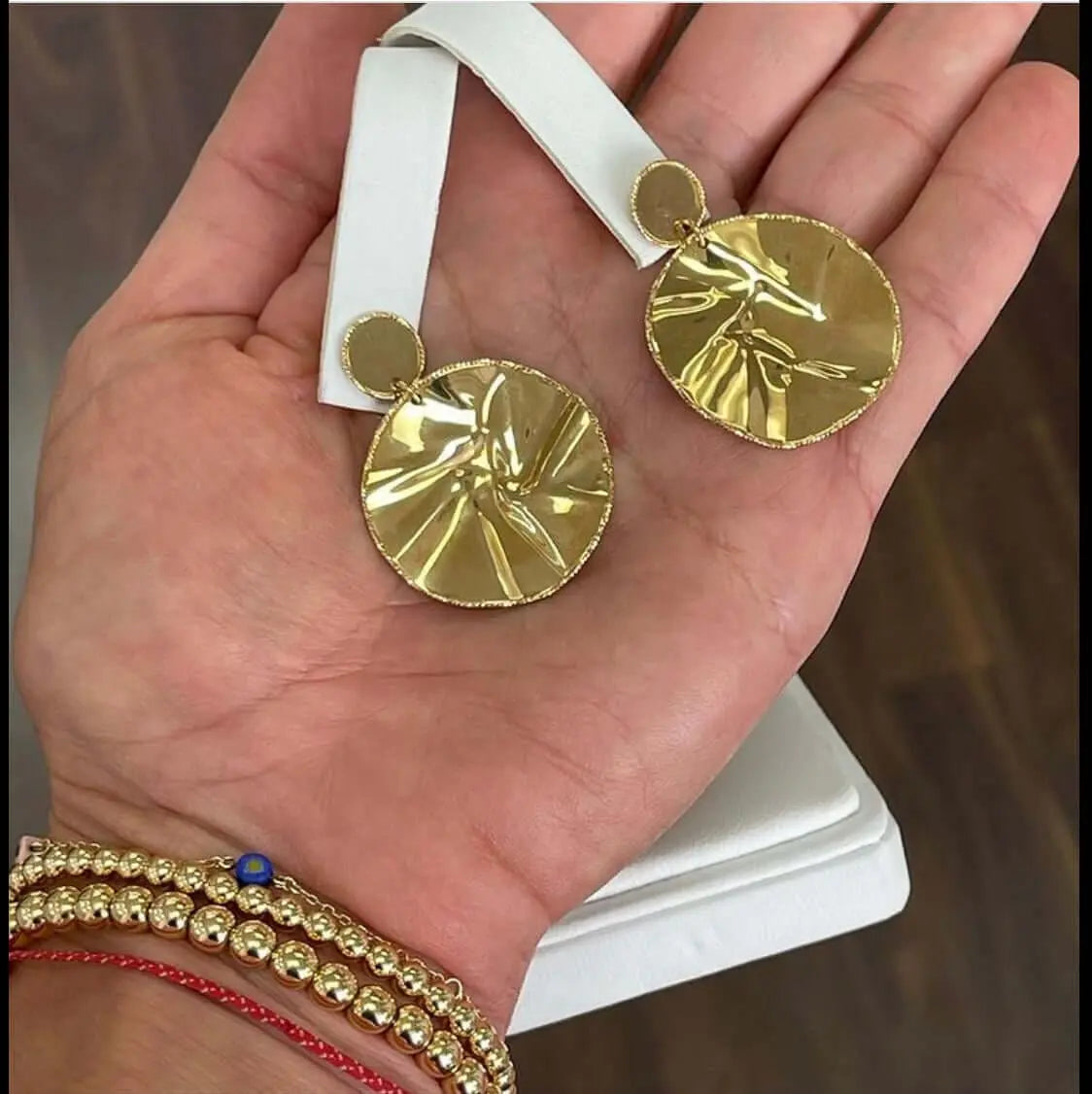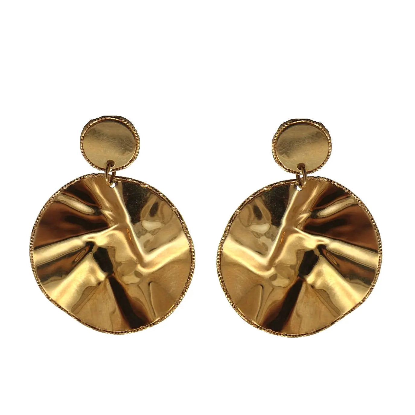 Explore the elegance of Amalia's 18K Yellow Gold Circular Polished Dangle Earrings, featuring a unique wrinkled texture and a shiny edge. Size: 1.52 x 1.13 inches, 7.03 grams. These hypoallergenic, lead and nickel-free earrings are crafted in Arezzo, Italy. Comes in an Amalia blue box, perfect for gifting. Matching pendant and open ring available.