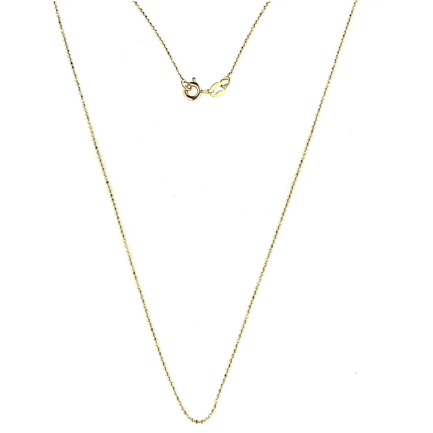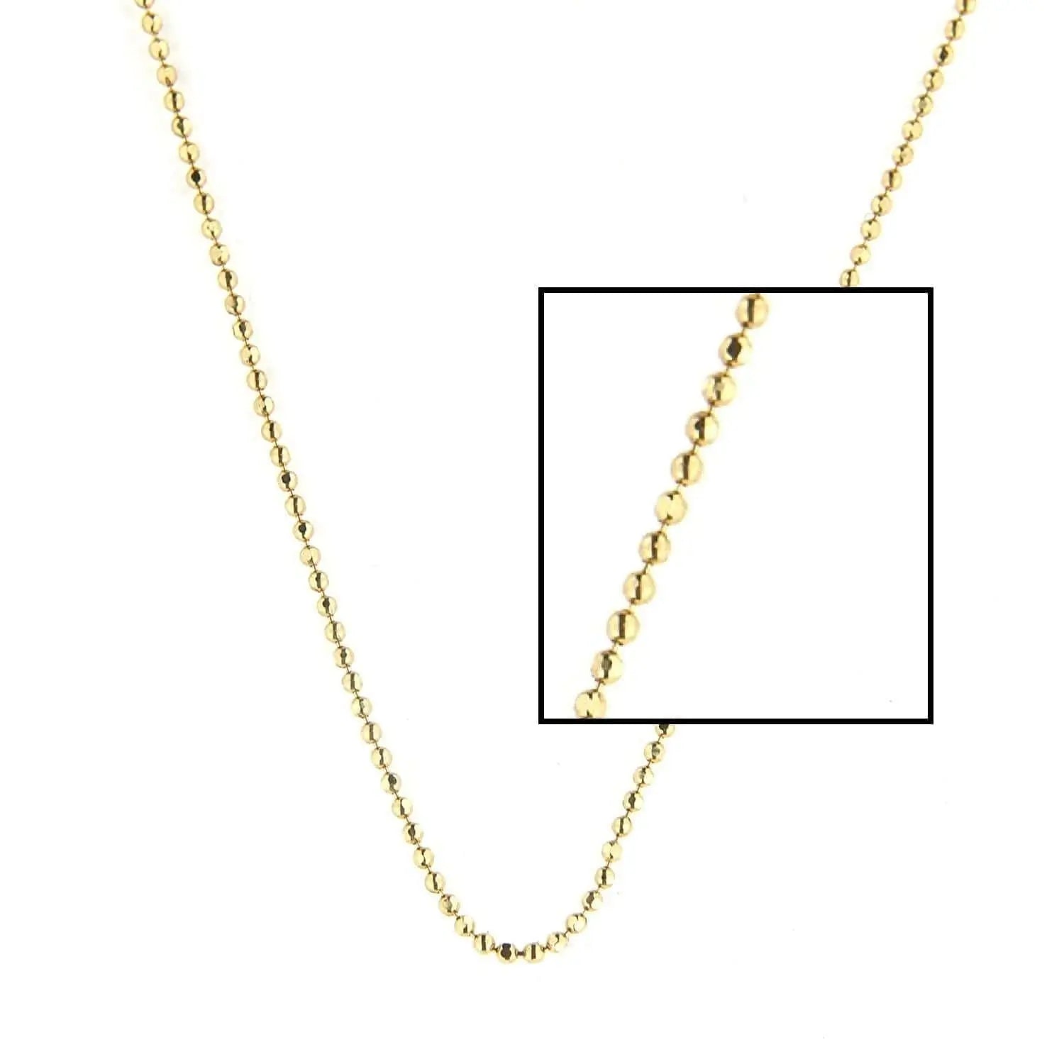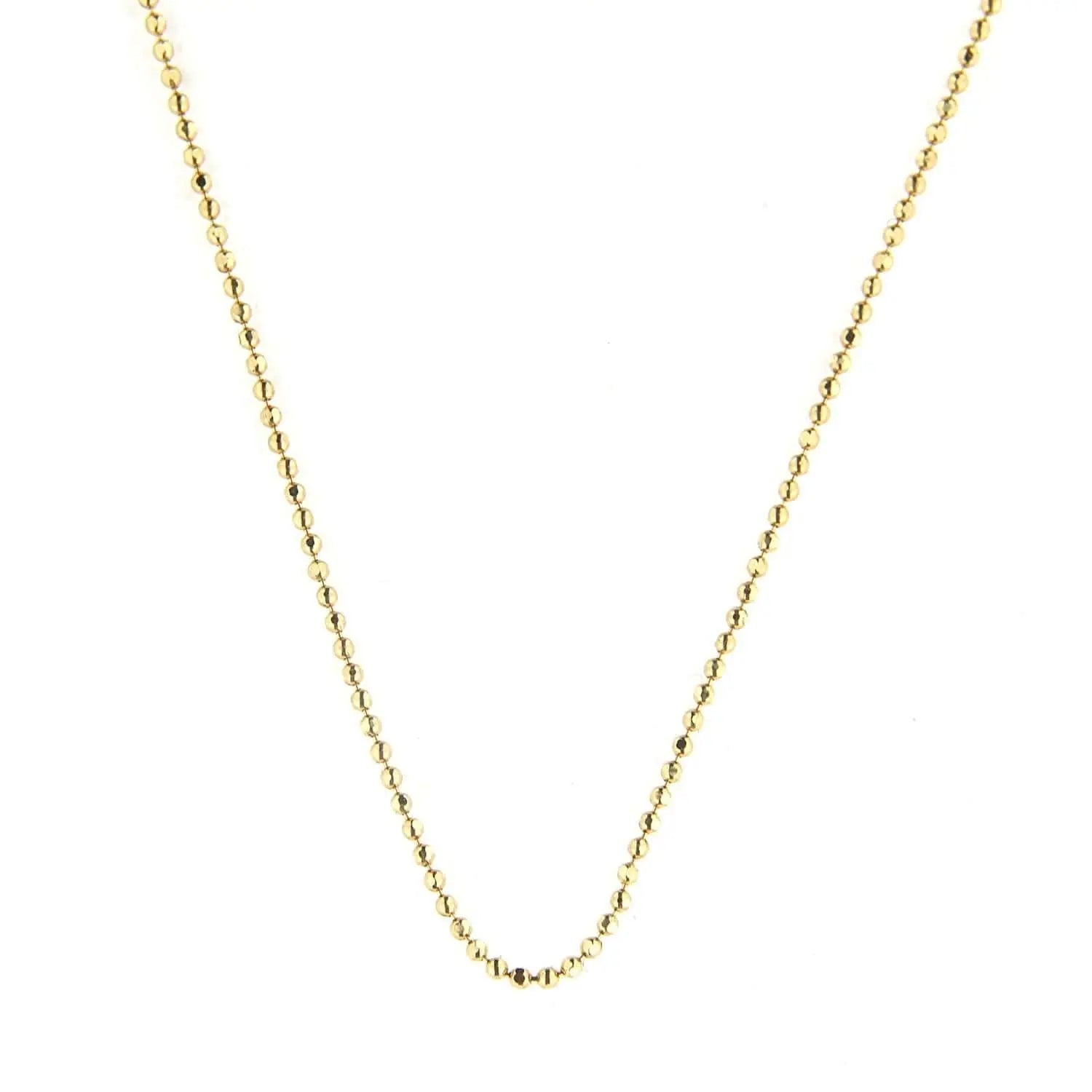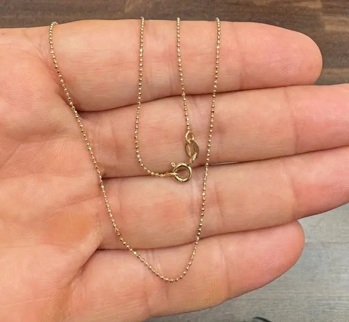 Discover the refined elegance of our 18K Solid Gold Yellow Gold Mini Diamond Cut Beads Chain. This exquisite piece features delicately crafted 1 mm beads, extending a full 18 inches in length. Each bead is precision-cut to enhance sparkle and brilliance, capturing light beautifully to accentuate any look. Made in Italy, this chain epitomizes high-quality craftsmanship and style.