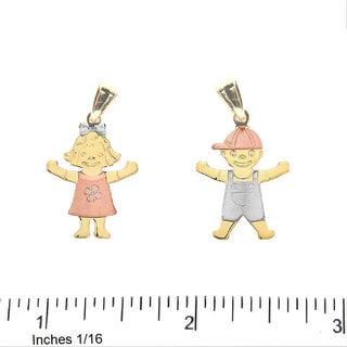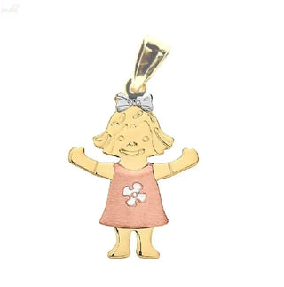 Embrace the special bond between a mother and daughter with the 18K Solid Tri-Color Gold Girl Charm Pendant with Dress and Bow. Expertly crafted in Italy, this heartwarming piece measures 0.74 x 0.60 inches (19 x 15 mm without the bail) and features exquisite tri-color details. The dress is finished in satin pink gold, adorned with a delicate white gold flower at the center, while the bow adds a touch of charm in polished white gold.