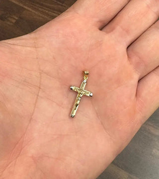 Gift a token of faith and elegance with our 18K Solid Two Tone Gold Polished Small Crucifix Pendant. This exquisite piece measures 1.09 x 0.52 inches, including the bail, and showcases a stunning two-tone design with white gold ends. Its modern and elegant crucifix is an ideal expression of spiritual commitment, making it a meaningful gift for baptisms, confirmations, or as a cherished keepsake.