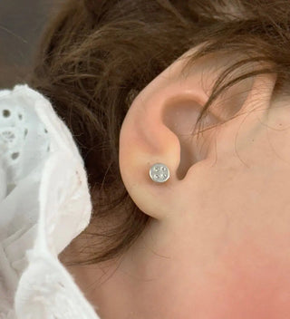 Elevate your little one's style with our enchanting 18K Solid White Gold Zirconia CIrcle Screwback Earrings. Crafted with precision and care, these exquisite earrings are designed to add a touch of elegance to any outfit. Measuring 4mm in diameter, they are perfectly sized for newborns up to 14-year-old girls, making them an ideal choice for every stage of her childhood. The screw back closure ensures a secure and comfortable fit, allowing your little one to wear them with confidence all day long.