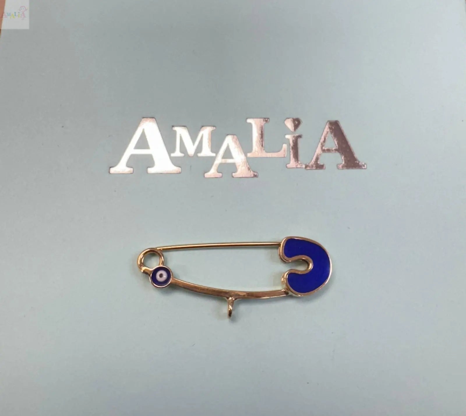 Arriving in a beautiful Amalia Blue Gift Box, this safety pin makes for a memorable and thoughtful gift, perfect for celebrating the precious arrival of a child. The mini evil eye charm symbolizes protection and love, making it not only a chic addition to his attire but also a meaningful one.