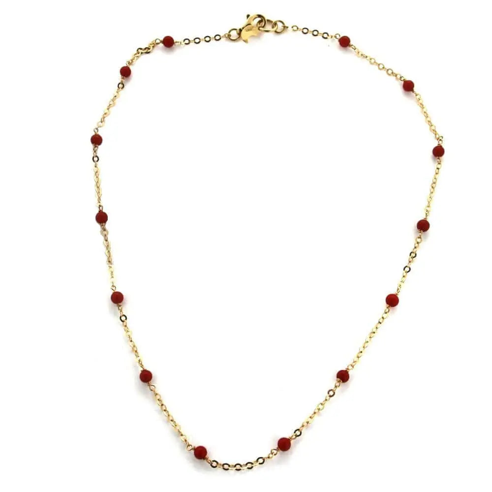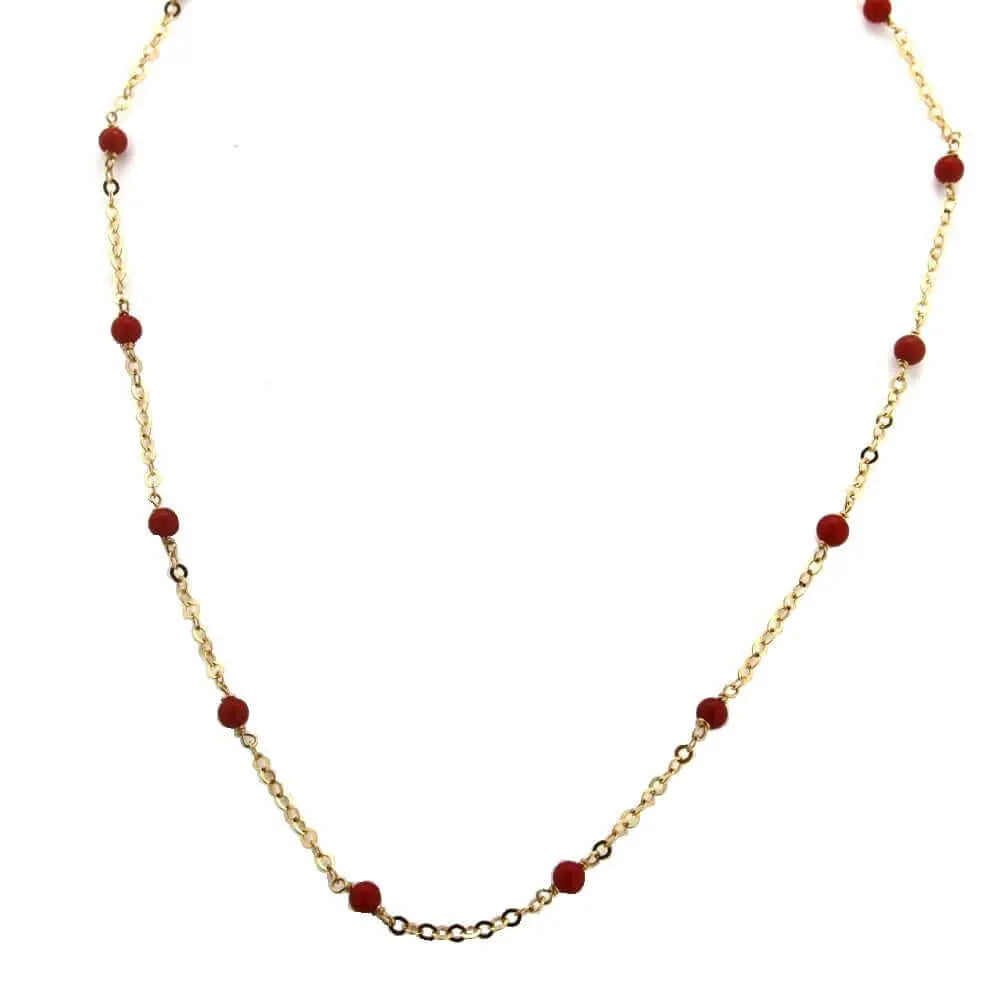 Coral beads are prized for their vibrant color and unique charm, evoking feelings of warmth, vitality, and sophistication. Known throughout history as symbols of protection and positive energy, coral has been cherished in jewelry for centuries. These coral paste beads add a distinctive flair, creating a necklace that stands out in any setting. The chain is crafted from hypoallergenic 18K solid yellow gold, ensuring it is safe and comfortable for sensitive skin.