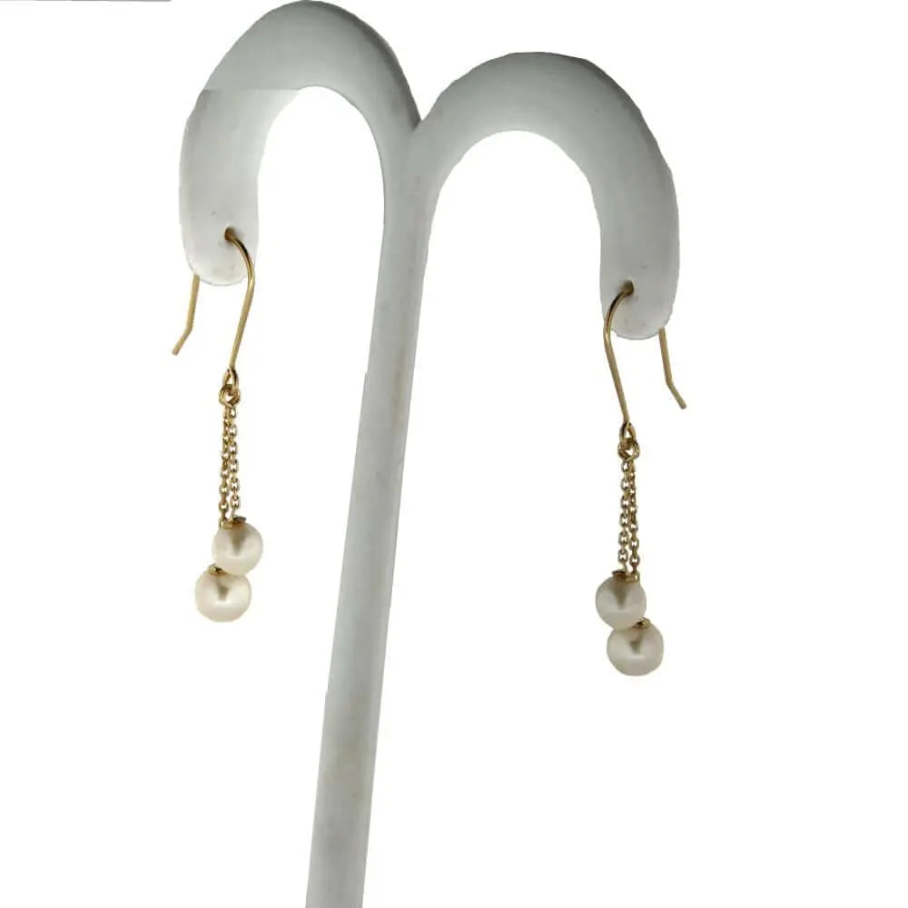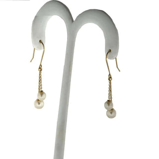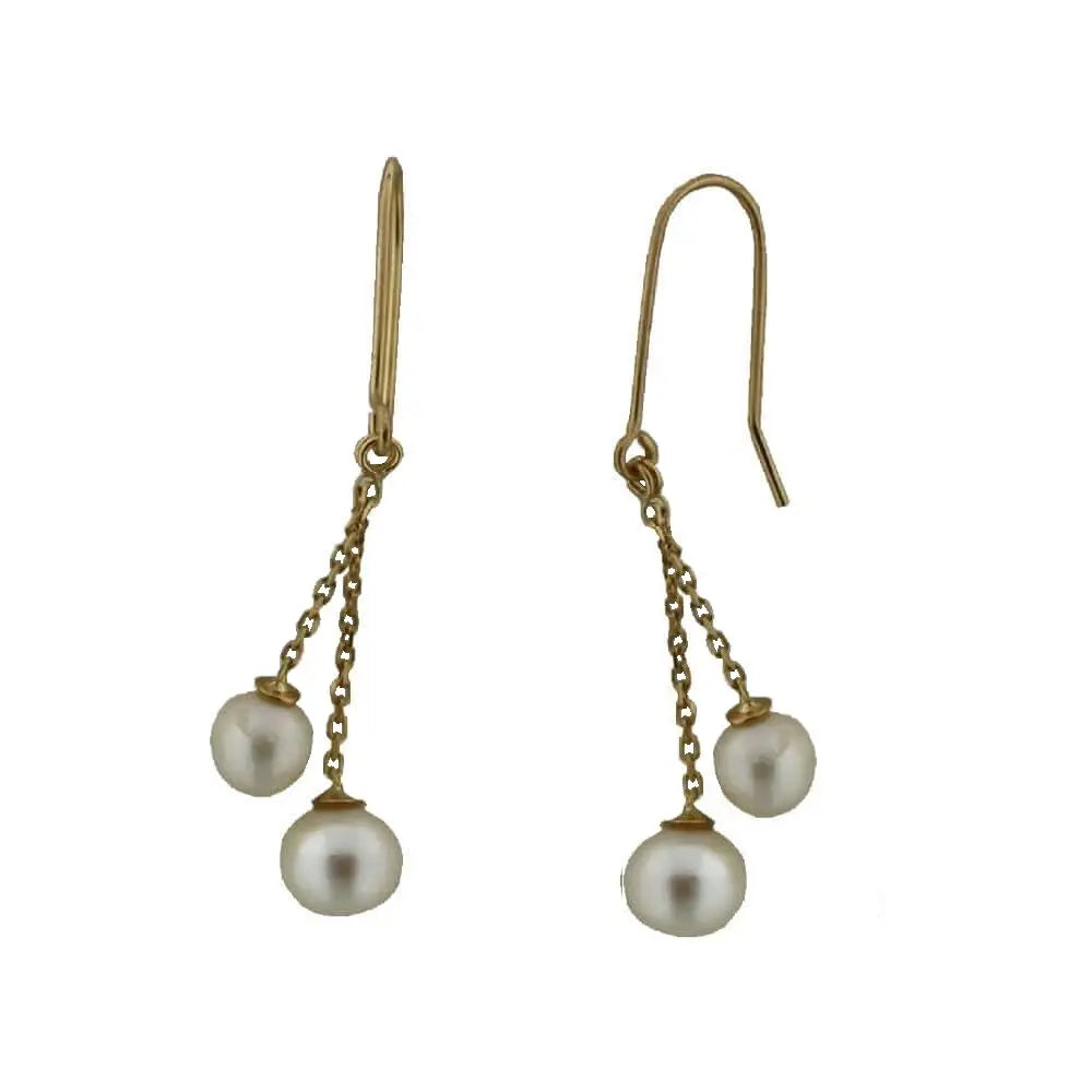 Introducing our exquisite 18K Solid Yellow Gold Dangle Two Cultivated Pearls Earrings, the perfect choice for anyone seeking a touch of sophistication. Each earring features two delicate chains of varying lengths, adding a modern asymmetrical flair to your look. One chain is adorned with a 5.8mm pearl, while the other holds a 5mm pearl, all elegantly dangling from a gold hook.