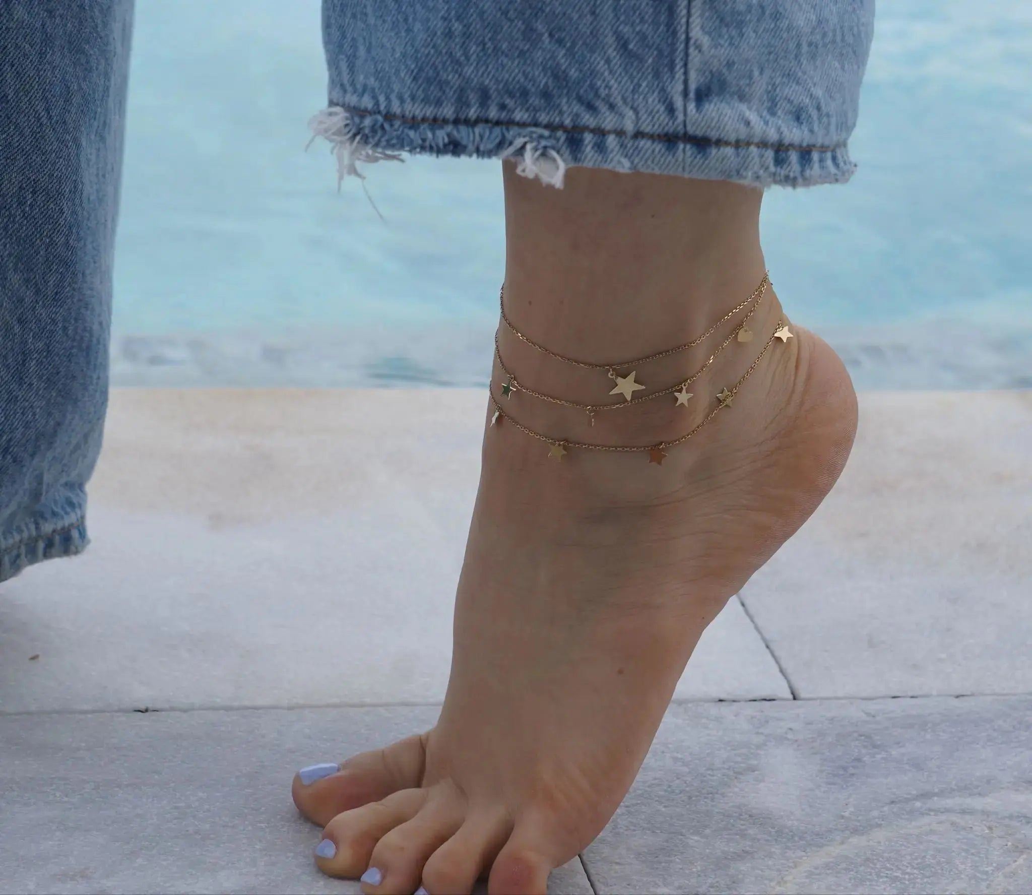 Sparkle by the Pool with Our Dazzling 18K Solid Yellow Gold Dangling Stars and Hearts Anklet