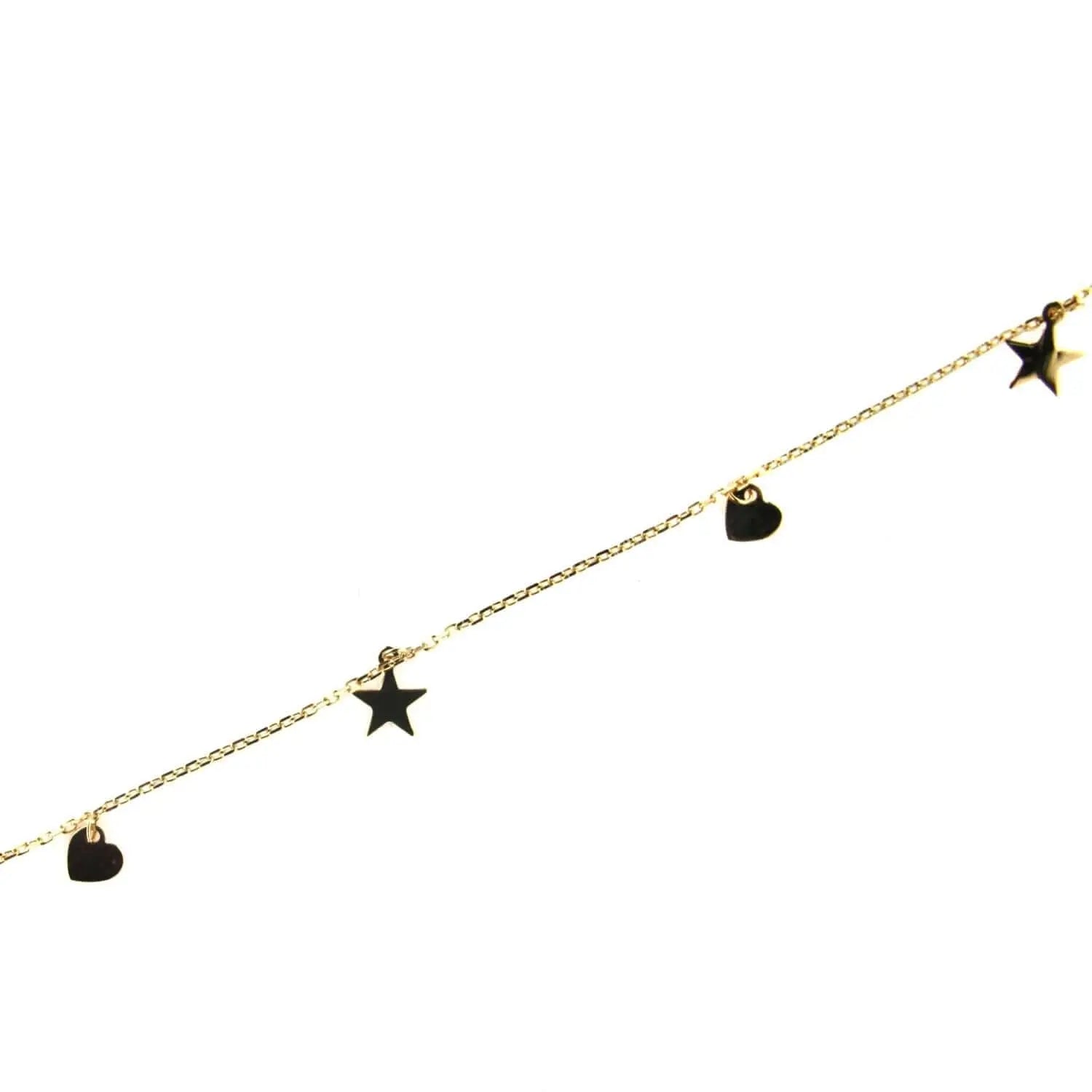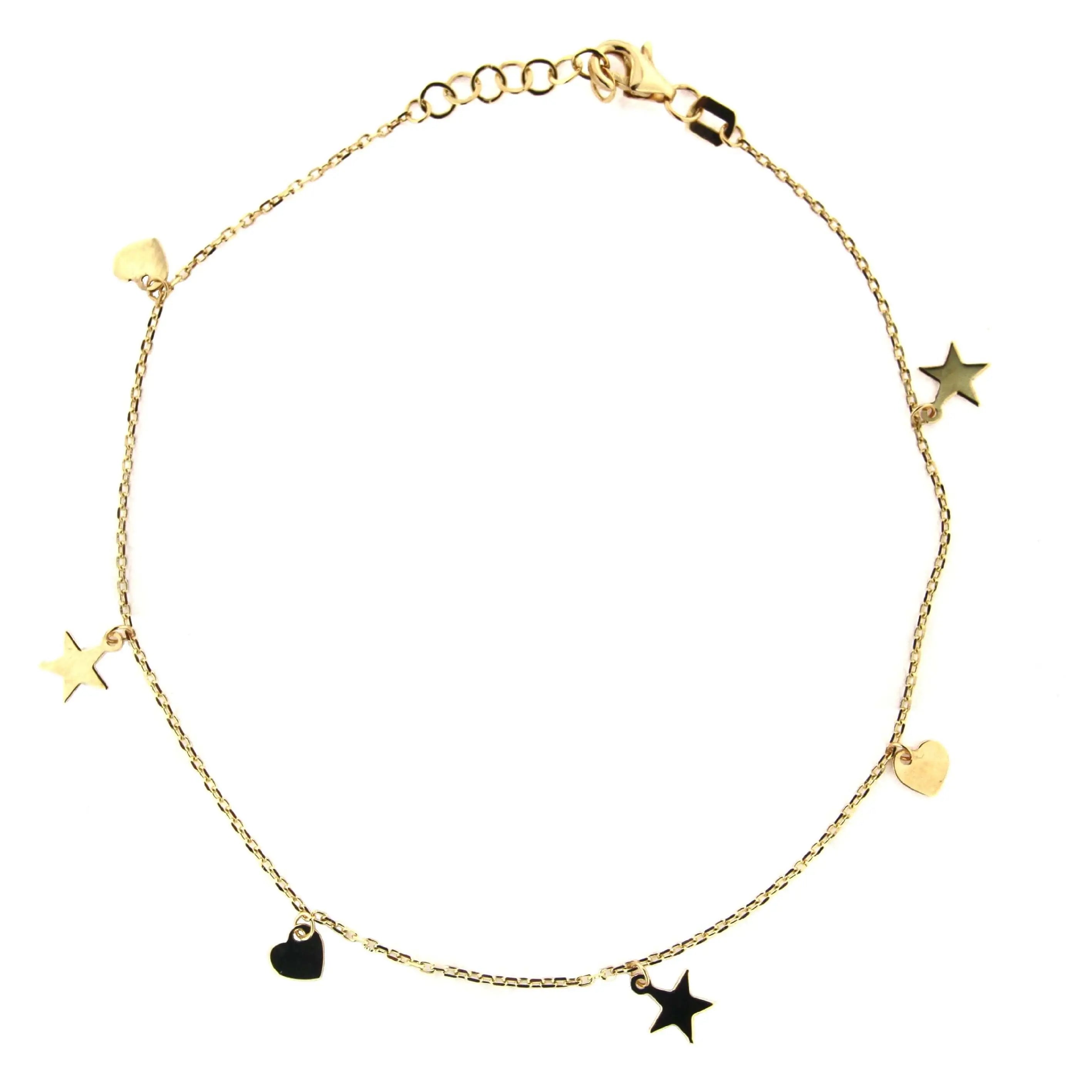 18K Solid Yellow Gold Dangling Stars and Hearts Anklet