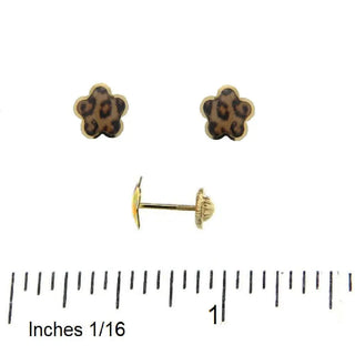 18K Solid Yellow gold Leopard enamel print Flower shape Covered Screwback Earrings