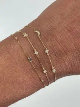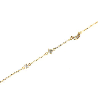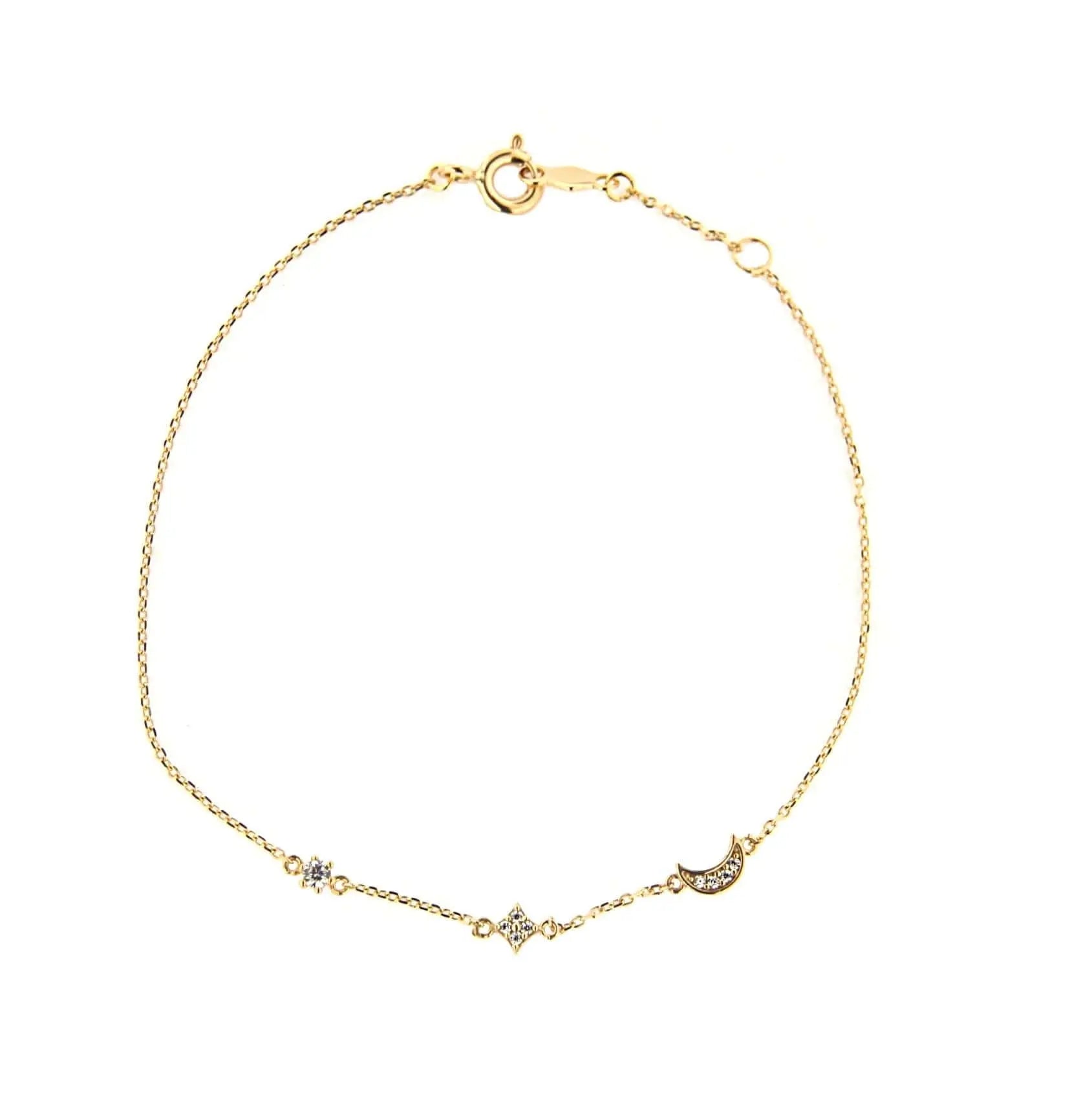Dazzle in 18K Gold Moon & Stars - This exquisite bracelet measures 7 inches with an extra ring at 6.25 inches. Crafted in 18K hypoallergenic gold, it comes in an Amalia gift box and bag. A perfect gift for minimalistic teenagers, it features a tiny zirconia moon, a center zirconia star, and tiny 2mm zirconia, all in line.