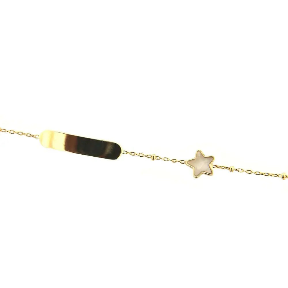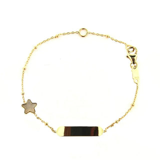 Make your child feel special with this 18k Solid Yellow Gold Mother of Pearl Star ID Bracelet bead chain from Amalia Jewelry. Perfectly sized for children ages 0 to 5 years old, this bracelet measures 5.5 inches with an extra ring at 4.75 inches. The beautiful mother of pearl star adds a unique and elegant touch to this classic piece. Each bracelet comes packaged in an elegant Amalia Gift box and bag, making it a perfect gift for your little one or for any young child. Give the gift of luxury with this premium quality 18k Solid Yellow Gold Mother of Pearl Star ID Bracelet bead chain, available now at Amalia Jewelry.