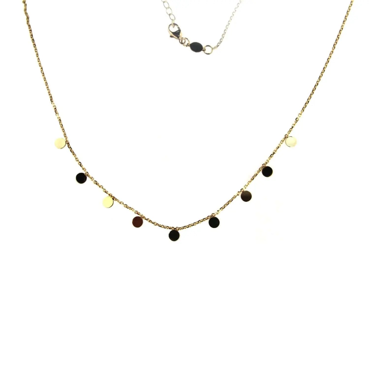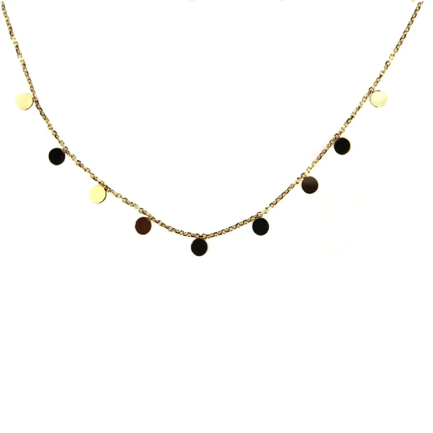 Elevate your look with our 18k Solid Yellow Gold Dangling Circles Cable Chain Necklace, featuring a 17-inch size with adjustable rings starting at 16 inches and lobster clasp. Crafted from luxurious 18k gold, this exquisite piece arrives in an Amalia box, making it a perfect addition to your jewelry collection.
