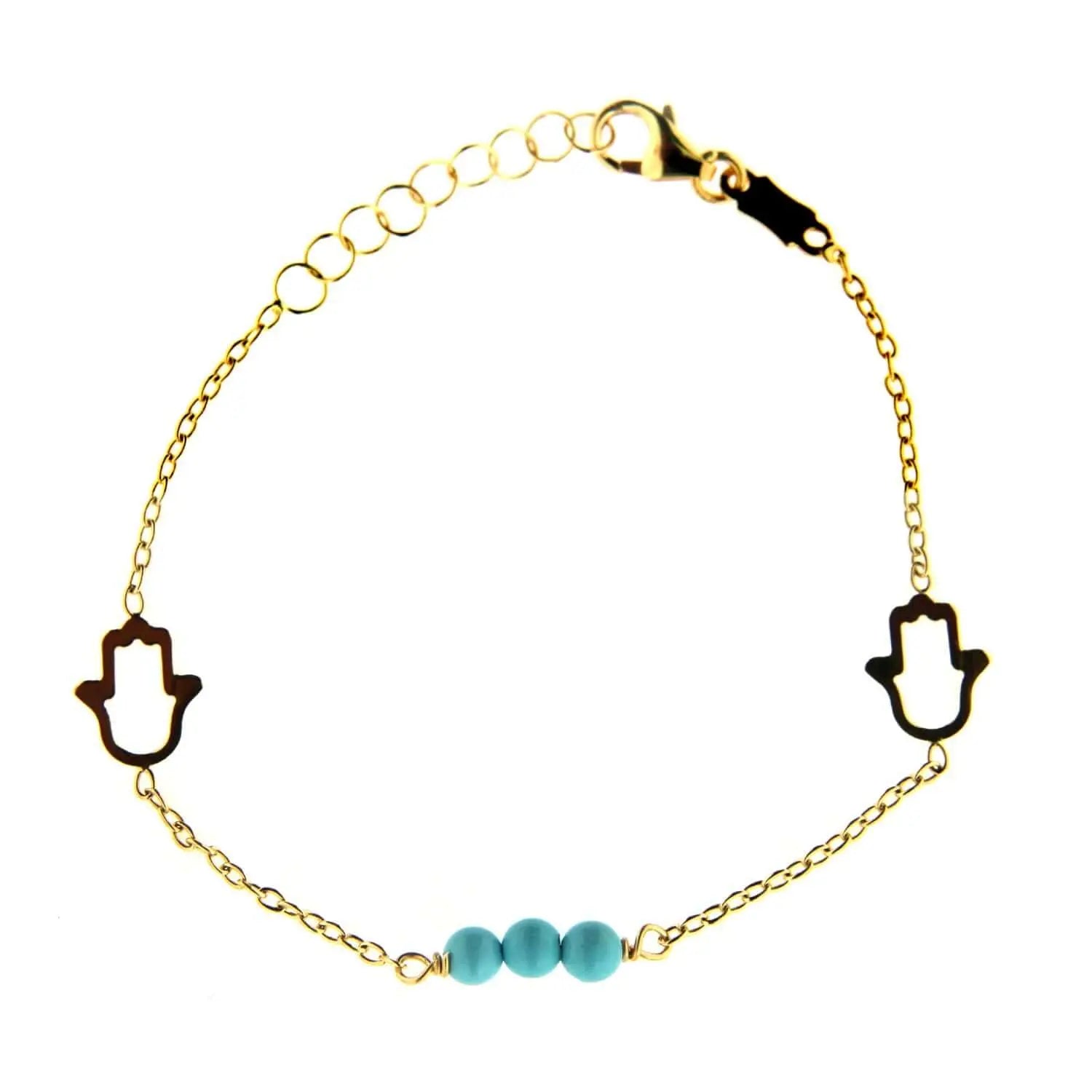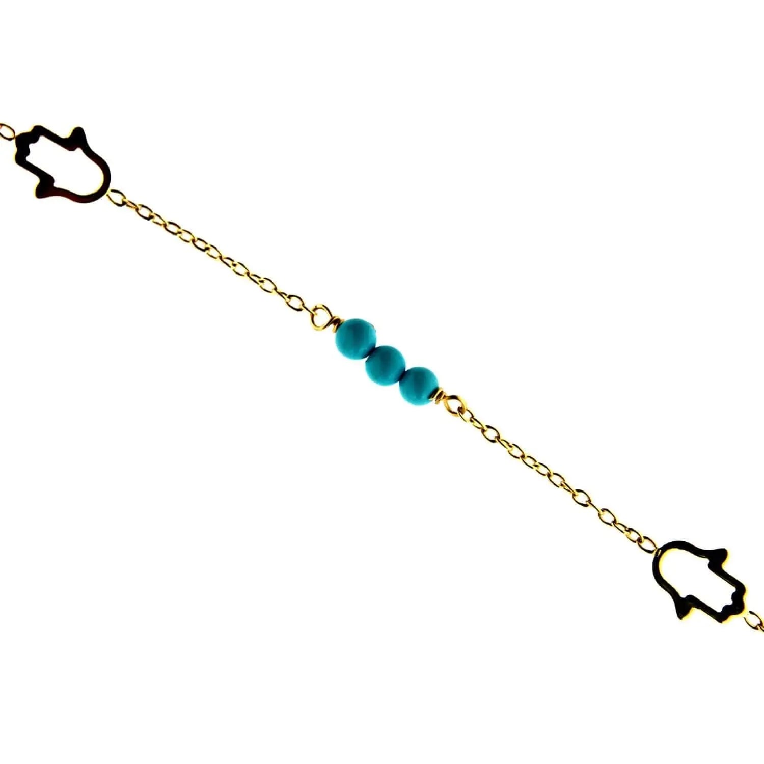 18K Yellow Gold Open Hamsa Hand and Turquoise Bead Bracelet. Measuring at 5.5 inches with extra rings starting at 4.8 inches, this bracelet is perfect for ages 0 to 6 years old. The Hamsa hand is a powerful symbol of protection and good luck, originating in Middle Eastern cultures. The turquoise stone, known for its vibrant blue-green hue, has been valued for thousands of years for its beauty and healing properties. This stunning bracelet is the perfect accessory to bring a touch of cultural richness and positive energy to your little one's life.