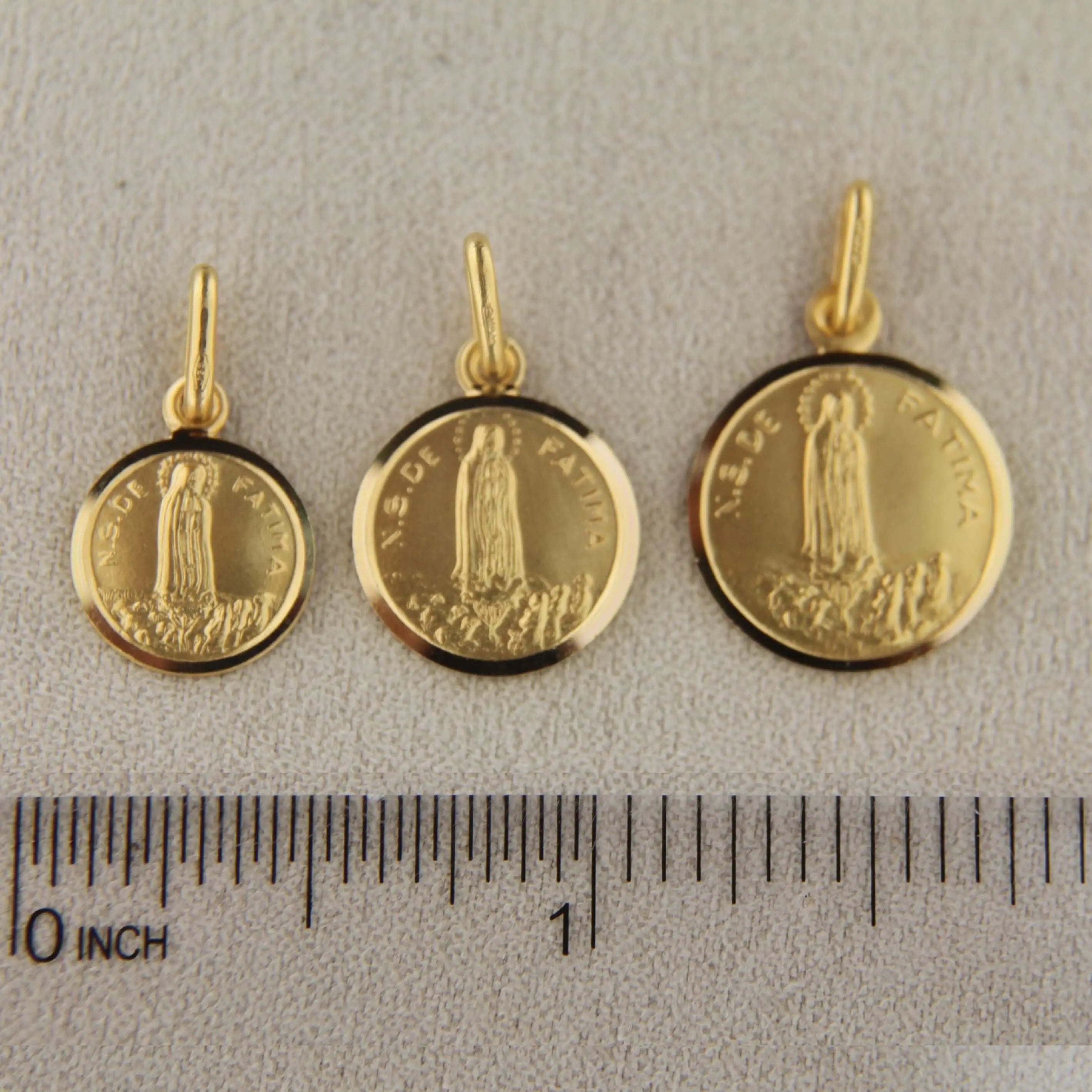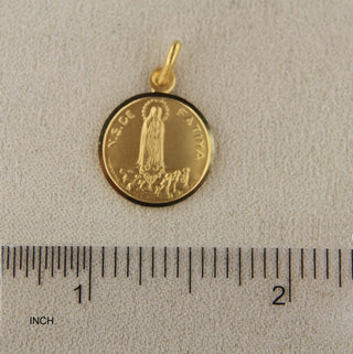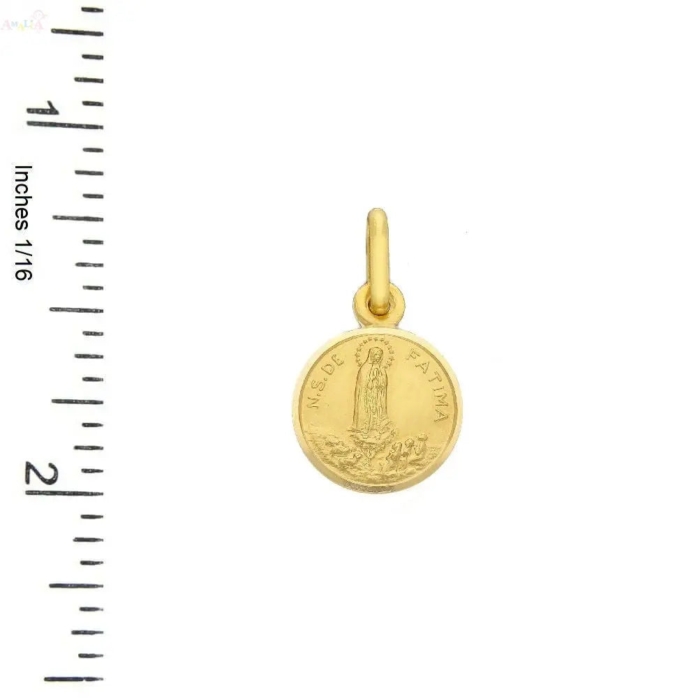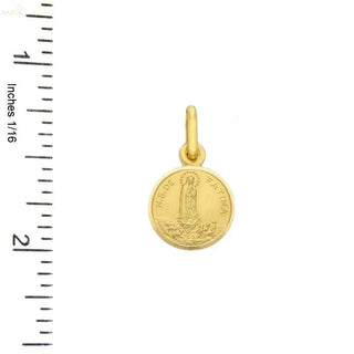 This 18K Solid Yellow Gold Our Lady of Fatima Medal 11mm features an elegant round design with the words "N.S.DE FATIMA" on the front. Crafted from hypoallergenic 18K yellow gold, this medal comes in three different diameter sizes. 11, 13 & 15 mm. This one has a diameter of 0.43 inches 11 mm. The medal comes with a beautiful Amalia gift box and bag, making it a perfect gift for any special occasion.