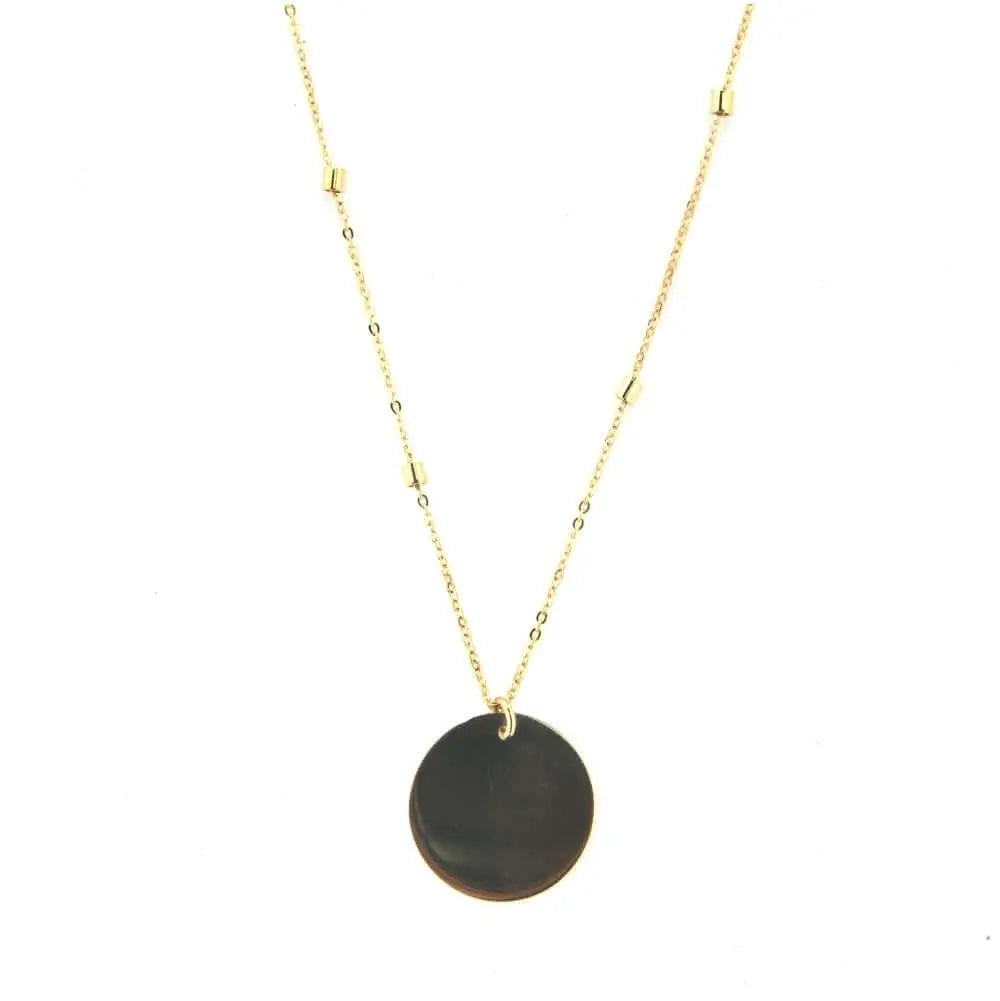 This 18k solid yellow gold medallion features a polished center circle and comes with a diamond cut chain. The medallion has a diameter of 0.47 inches and can be engraved for a personal touch. The chain is 18 inches in length. The piece comes packaged in a beautiful Amalia gift box and bag, making it the perfect gift for any occasion.
