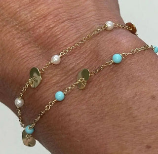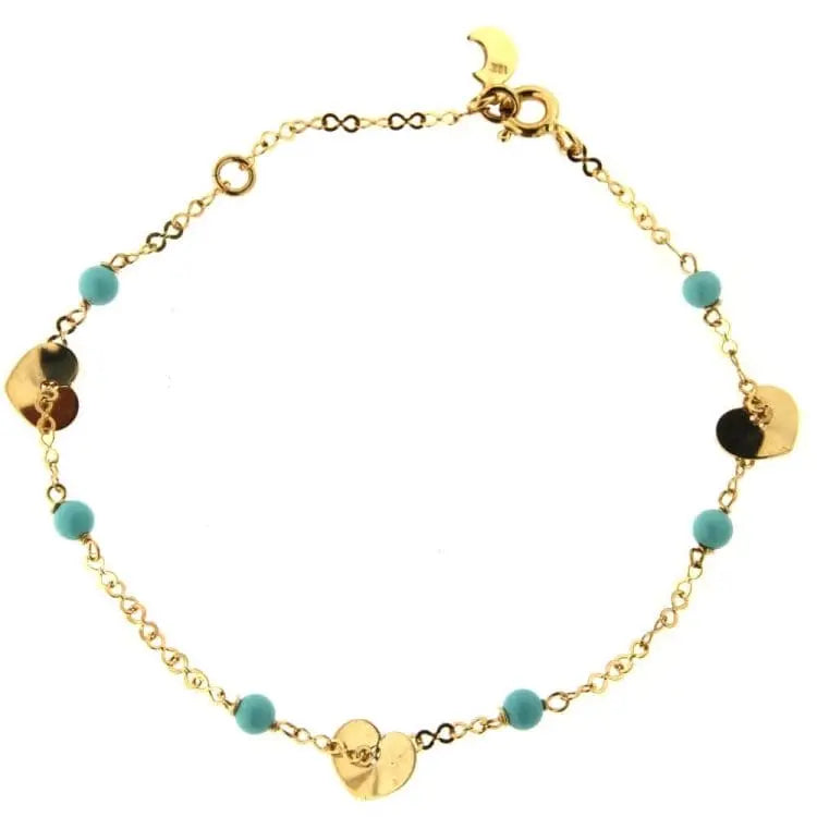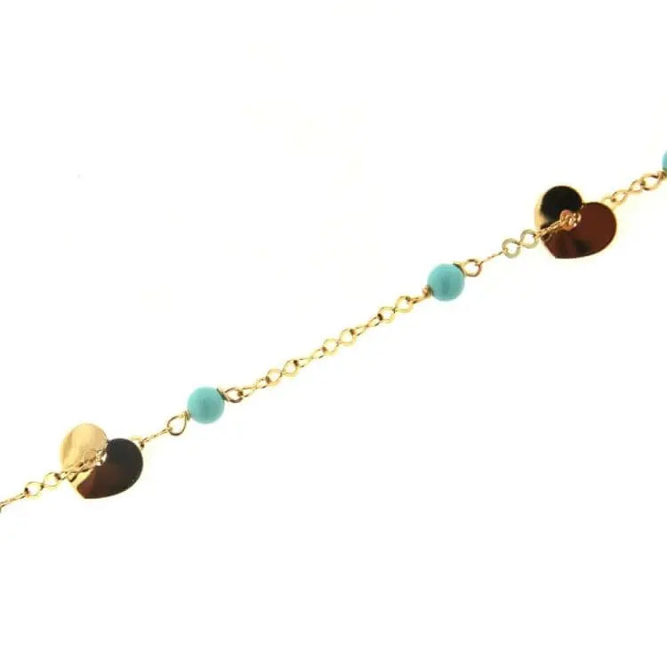 Crafted from hypoallergenic 18K solid yellow gold, it is lead and nickel-free, ensuring a safe and irritation-free experience for even the most sensitive skin. The diamond-cut chain gracefully threads through three polished hearts and six turquoise paste beads, creating a timeless and vibrant design.