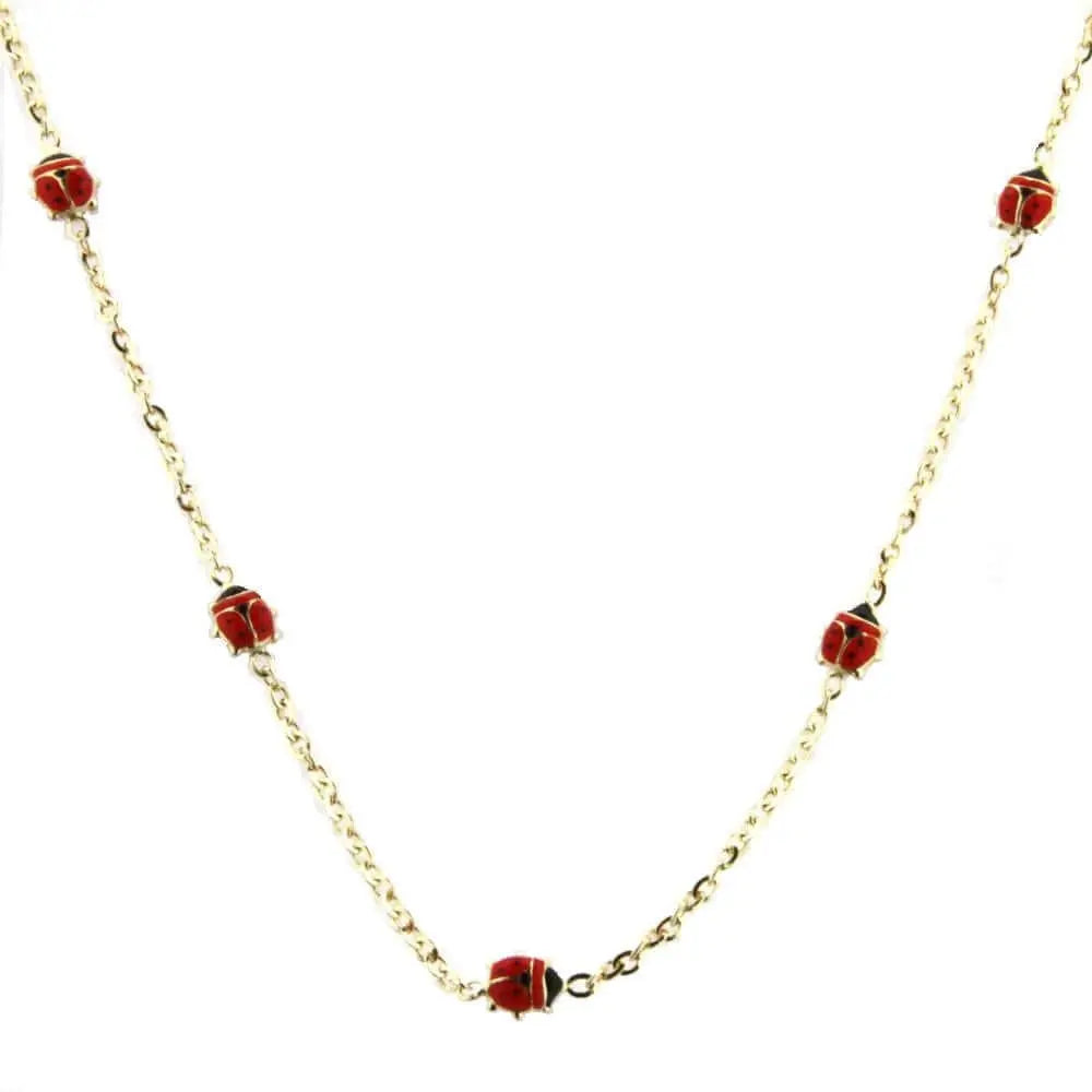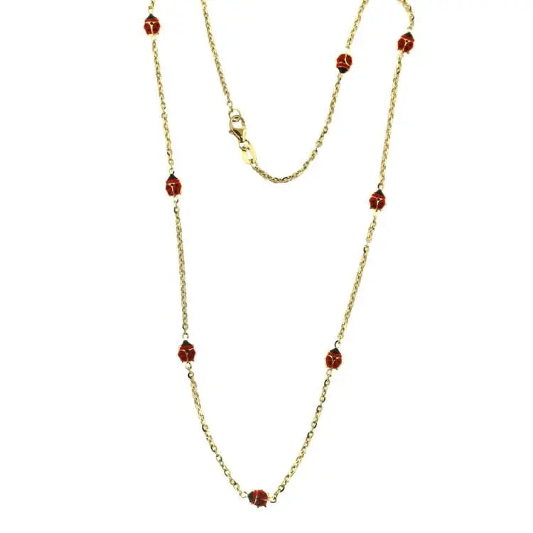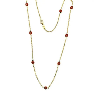 Experience the captivating beauty of our 18K Solid Yellow Gold Red Enamel In-line Ladybug Necklace , adorned with a delightful arrangement of eight charming ladybugs. Meticulously crafted in Italy using 18K hypoallergenic, lead, and nickel-free gold, this necklace showcases exceptional quality and style. Symbolizing the arrival of spring and renowned for bringing good luck, the ladybug is a cherished emblem of positivity. Designed for girls aged 13 years old and up 16 inches long, this enchanting necklace comes complete with an exquisite Amalia gift box and bag, making it a perfect gift choice. Embrace the joyful spirit and fortune associated with ladybugs, and let this exquisite necklace add a touch of whimsy and elegance to your ensemble.