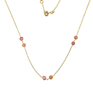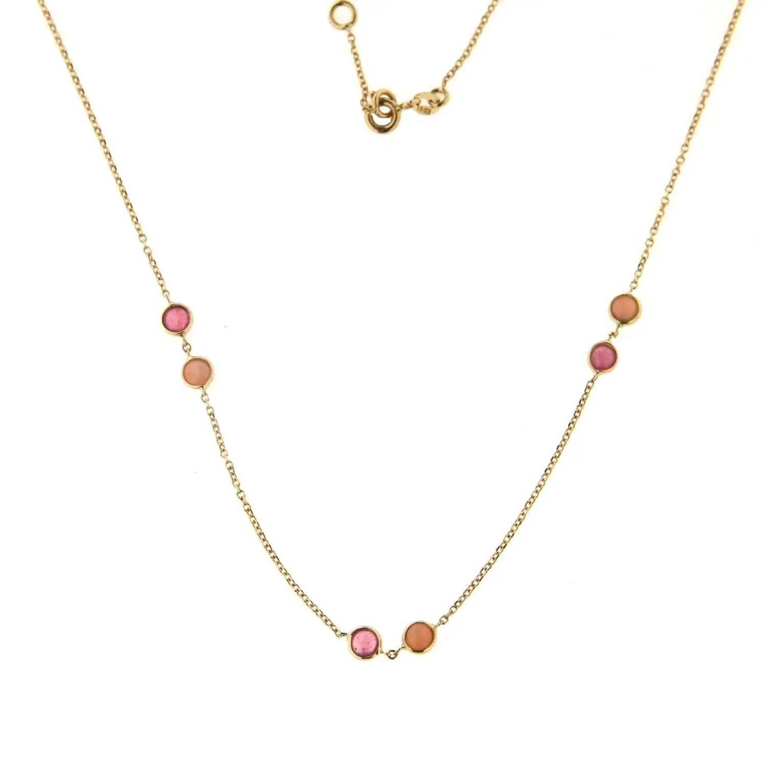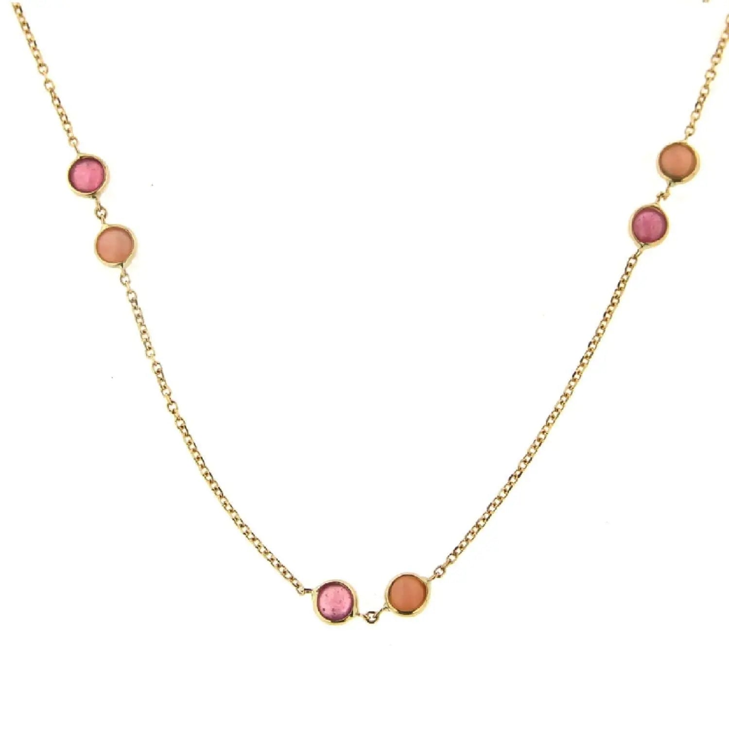 Indulge in the delicate beauty of our 18K Solid Yellow Gold Red Tourmaline and Pink Quartz Necklace. Expertly crafted to cater to both teenagers and adults, this necklace features a unique 16.25-inch chain with an additional sizing ring at 15.5 inches, ensuring a perfect fit for all. The design includes three exquisite stations, each adorned with a lustrous red tourmaline paired with a soft pink quartz, presenting a harmonious blend of vibrant and subtle hues.