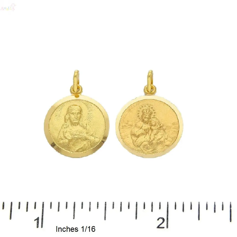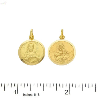 Indulge in a symbol of faith and timeless devotion with our 18K Solid Yellow Gold Round Scapular Medal Pendant 13 mm.. This exquisite piece draws inspiration from the traditional Catholic devotion to Our Lady of Mount Carmel, originating in the 13th century. The pendant showcases detailed imagery with the Sacred Heart of Jesus on the front and Our Lady of Carmel on the reverse, embodying Christ's love and Mary's maternal care.