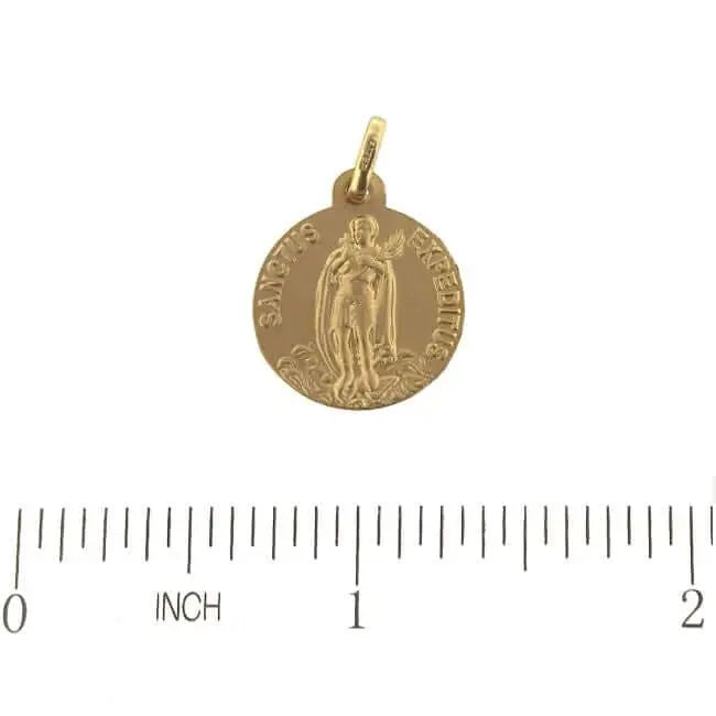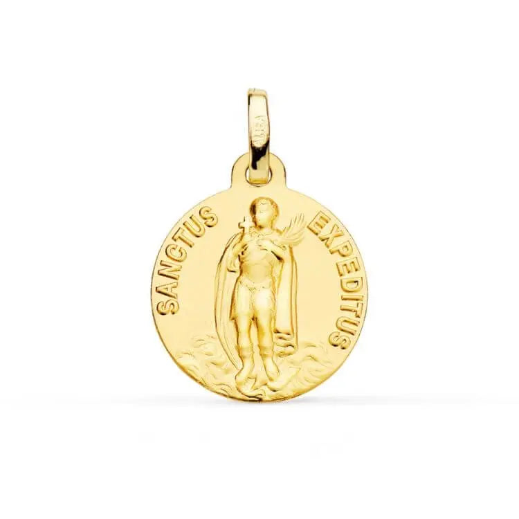 Embrace the power of Saint Expeditus with our 18k Solid Yellow Gold Saint Expeditus 16mm Medal Pendant, specially designed for those seeking timely help and divine intervention. This hypoallergenic, lead and nickel-free pendant is the perfect accessory to remind you of the saint's guidance in overcoming obstacles and finding swift solutions. Intricately crafted with a 0.63-inch (16mm) diameter, it showcases the elegance and grace of Saint Expeditus. Our pendant comes beautifully presented in an Amalia blue gift box, making it an ideal gift for loved ones facing challenges or in need of spiritual support.