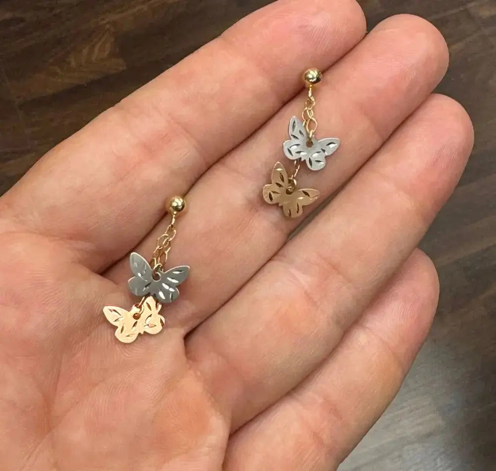 Celebrate every milestone in style with our enchanting 18K Three Color Solid Gold Butterflies Dangling Earrings, expertly crafted to captivate hearts of all ages. Whether it's a bat mitzvah, a cherished birthday, a quinceañera marking a girl's transition into womanhood, or a sweet 16 party filled with joy and excitement, these earrings are more than just accessories—they're timeless treasures that symbolize grace and elegance.