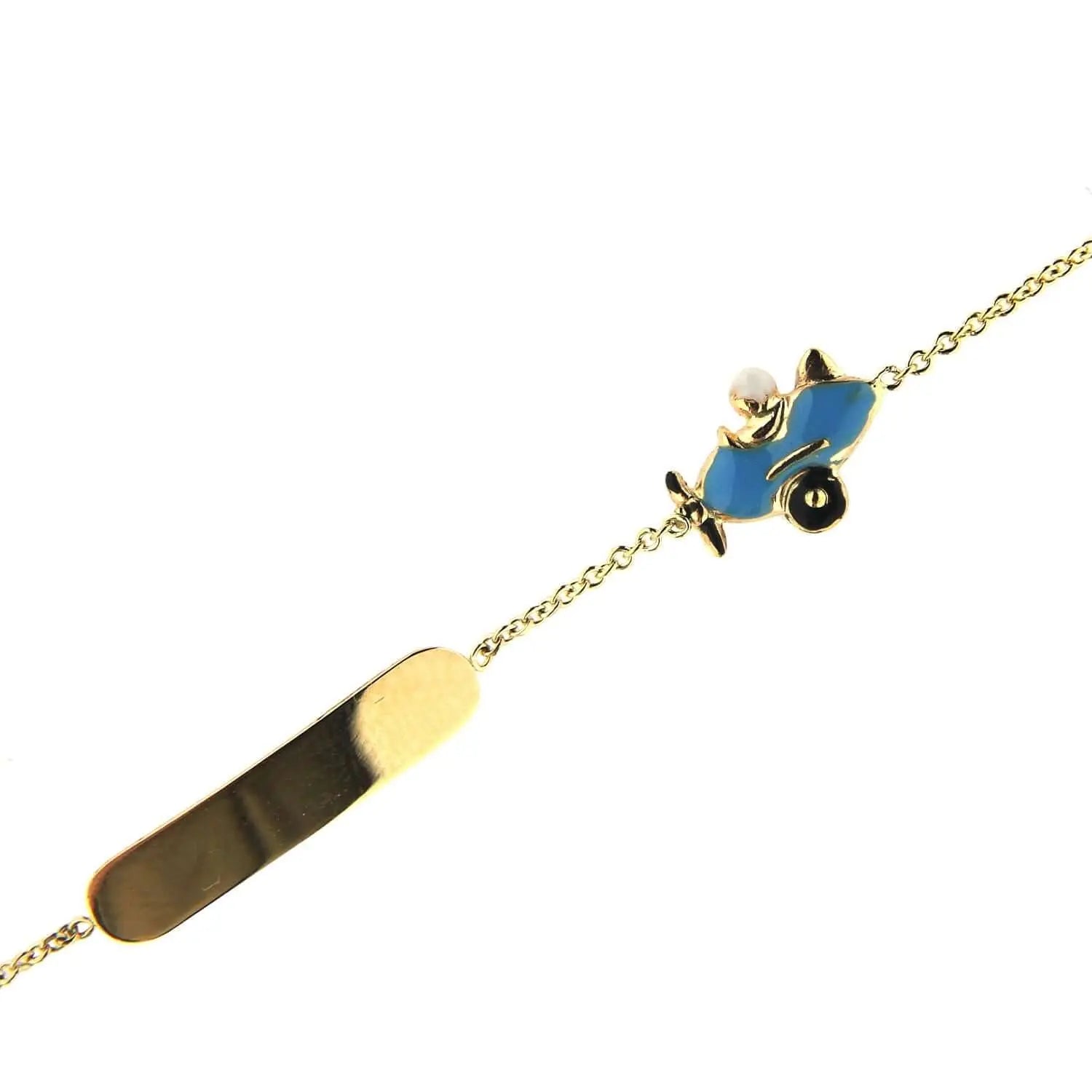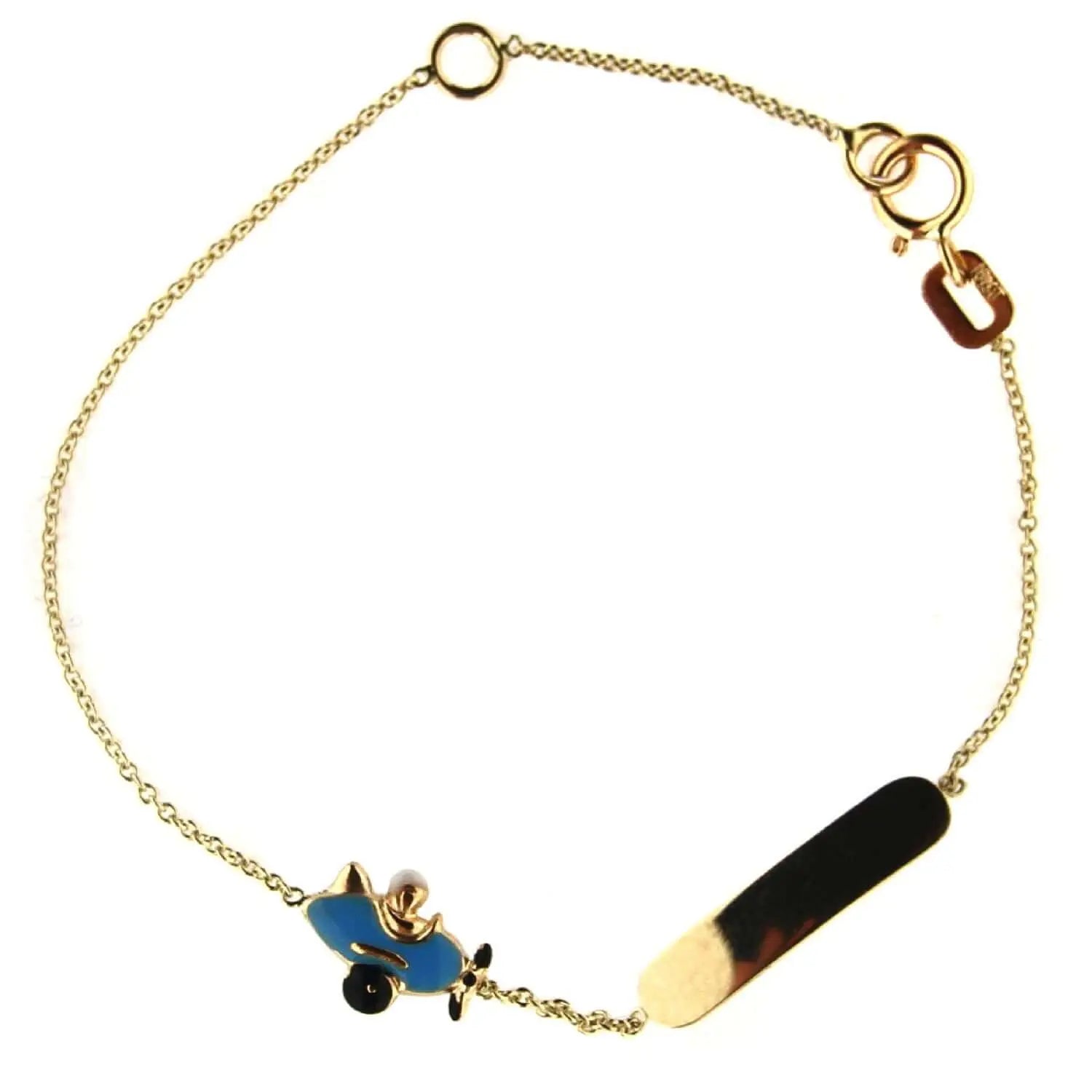 The highlight of this bracelet is its beautifully crafted monoplane design, complete with a pilot adorned in a white helmet, depicted in striking blue enamel against the rich backdrop of solid yellow gold. This unique and eye-catching accessory is perfect for daily wear or special occasions, adding a touch of playful elegance to any outfit.