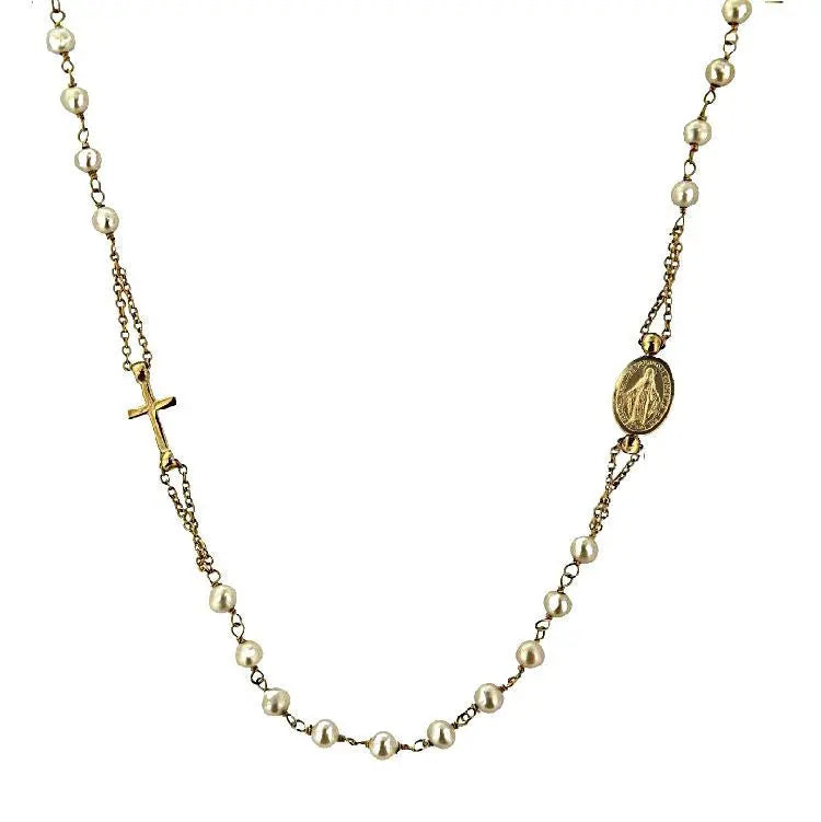 Featuring three sets of 10 lustrous 3mm cultivated pearls, the Miraculous Medal measures 0.35 x 0.25 inches, and the Cross is 0.48 x 0.24 inches. Fasten it securely with the lobster clasp and revel in the exquisite presentation, complete with an Amalia gift box and bag.
