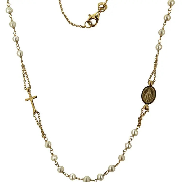 This necklace is more than just an accessory; it's a statement of faith and sophistication, perfect for any special occasion. Each detail, from the delicate pearls to the beautifully crafted medals, reflects the fine Italian craftsmanship and the enduring elegance of 18K gold.