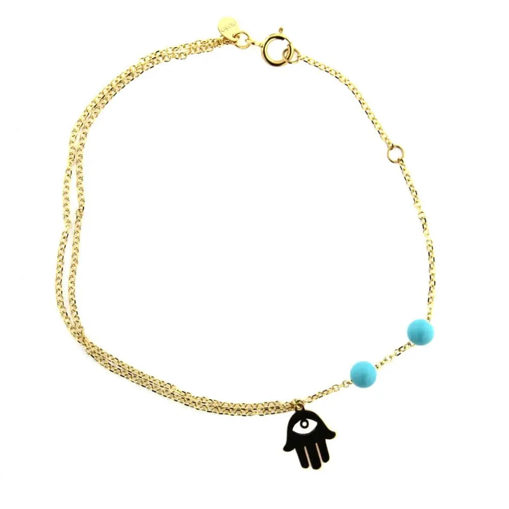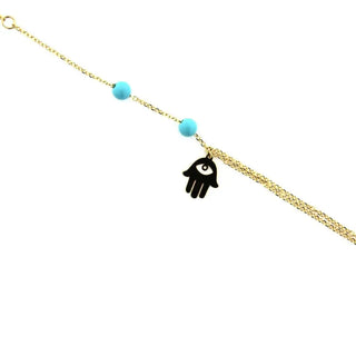 From the Hamsa pendant extend two diamond-cut cable chains leading to a spring ring clasp on one side and a single matching chain on the other, adorned with two loose 3.90 mm turquoise beads for a pop of color and energy. Crafted from hypoallergenic, nickel- and lead-free 18K solid yellow gold, this bracelet is gentle on the skin and built to last.