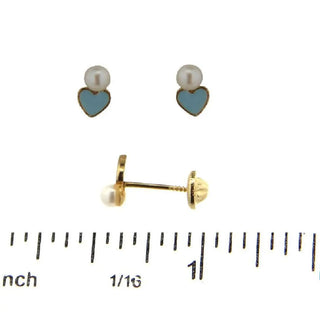 Add a touch of elegance to your little girl's look with these stunning 18K Yellow Gold Pearl with Blue Heart Screwback Earrings. Measuring 0.24 x 0.16 inch (6x4 mm) and featuring a 3mm cultivated pearl, these delicate earrings are crafted with hypoallergenic 18K gold that is lead and nickel-free, making them perfect for girls with sensitive skin.