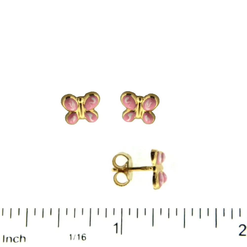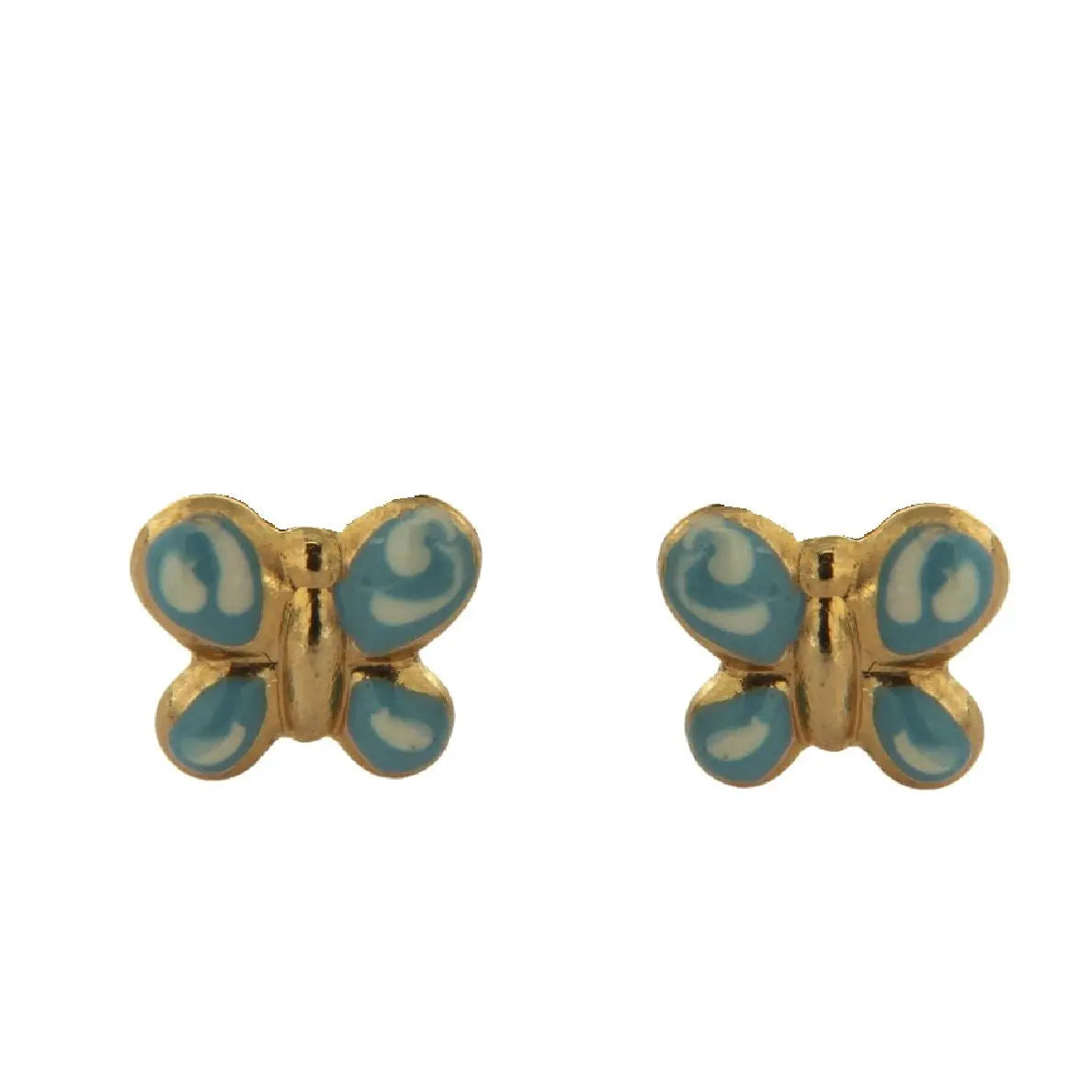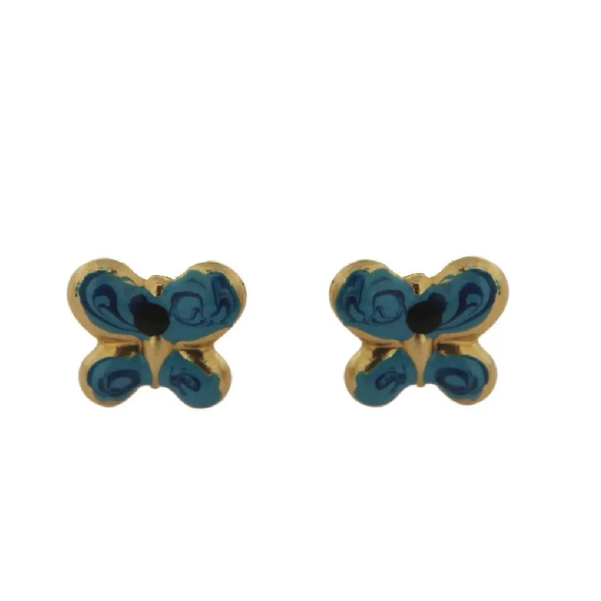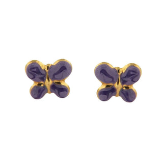 Introduce a burst of color and charm with the 18K Yellow Gold Enamel Butterfly Earrings, perfect for ages 4 and up. These small and delightful earrings, sized at 0.26 x 0.31 inches (7 x 8 mm), feature an enchanting swirl enamel design in light blue, pink, rose, yellow, lavender ,green or blue. Crafted from hypoallergenic 18K yellow gold, they're gentle on sensitive skin and ideal for young jewelry enthusiasts. Match these whimsical butterfly earrings with our butterfly enamel pendant for a coordinated look. Each pair is presented in an Amalia gift box and bag, making them a perfect gift or a cherished addition to a young one's growing jewelry collection.