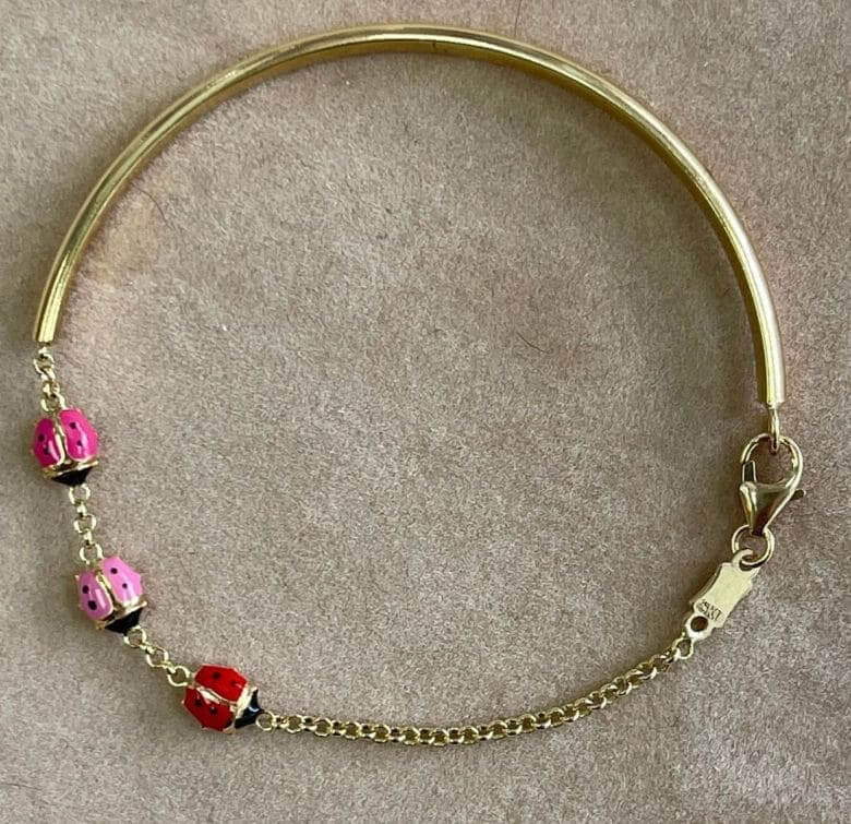 Delicate enamel ladybugs in vibrant red, pink, and fuchsia grace the bracelet, adding a touch of whimsy and meaning. Ladybugs have long been associated with good fortune, making this bangle a heartfelt gift that carries both beauty and positive symbolism. Packaged in an elegant Amalia Gift Box and Bag, it’s ready to delight from the moment it’s opened. Whether as a first birthday present, a keepsake for a special occasion, or a cherished family tradition, this baby bangle is a timeless treasure.
