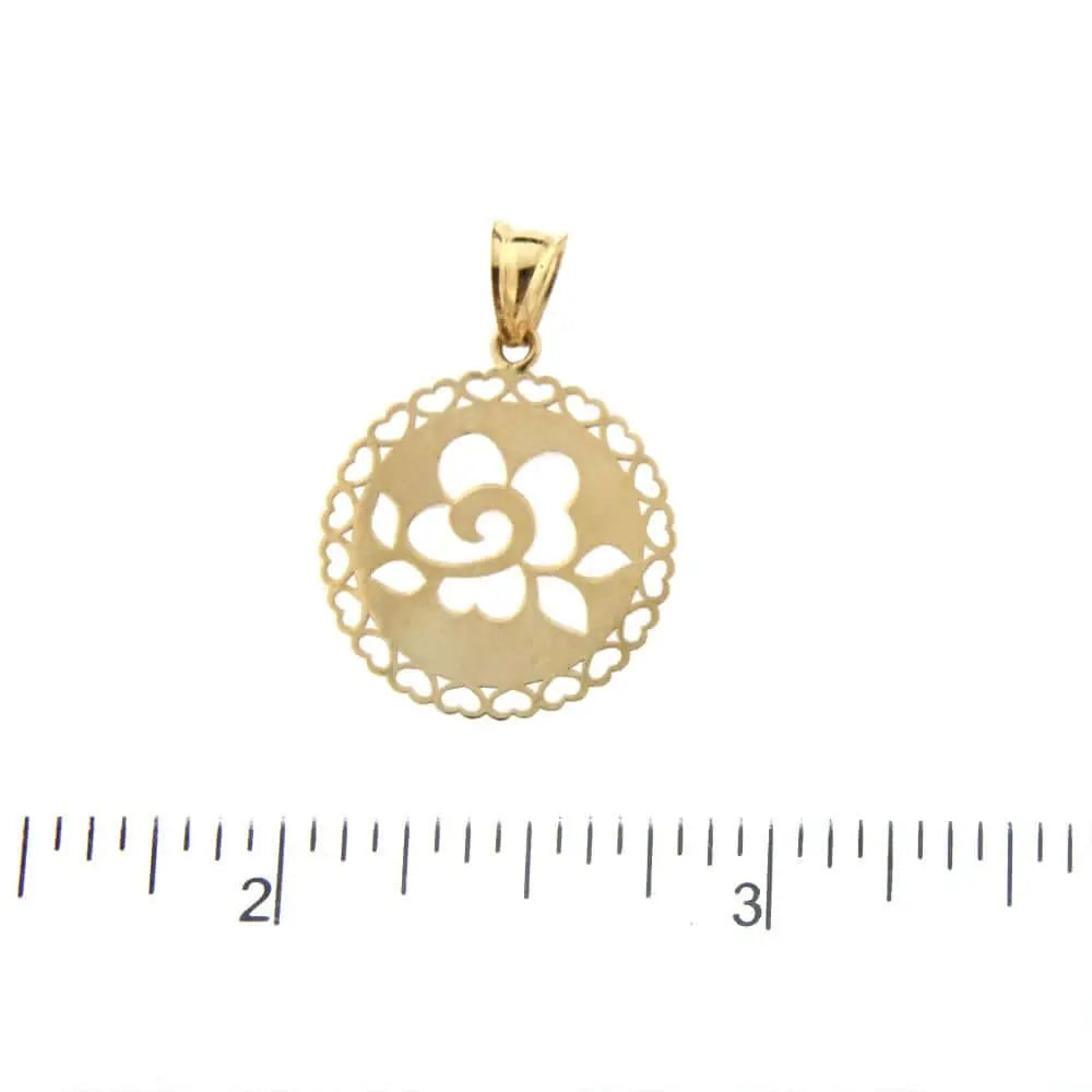 Introducing our exquisite 18K Solid Yellow Gold Open Cut Rose Pendant 0.75in Diameter, meticulously crafted to capture the essence of timeless beauty and sophistication. This pendant features a delicate open-cut rose design, intricately detailed and suspended from a fine chain.Crafted from solid 18K yellow gold, this pendant radiates luxurious elegance and enduring quality. With a diameter of 0.75 inches, it serves as a versatile statement piece, adding a touch of refinement to any attire.Presented in a stylish gift bag and box, this pendant makes a thoughtful and elegant gift for a loved one or a cherished addition to your own collection. Elevate your style with the timeless allure of our 18K Solid Yellow Gold Open Cut Rose Pendant—an emblem of refined elegance and grace.