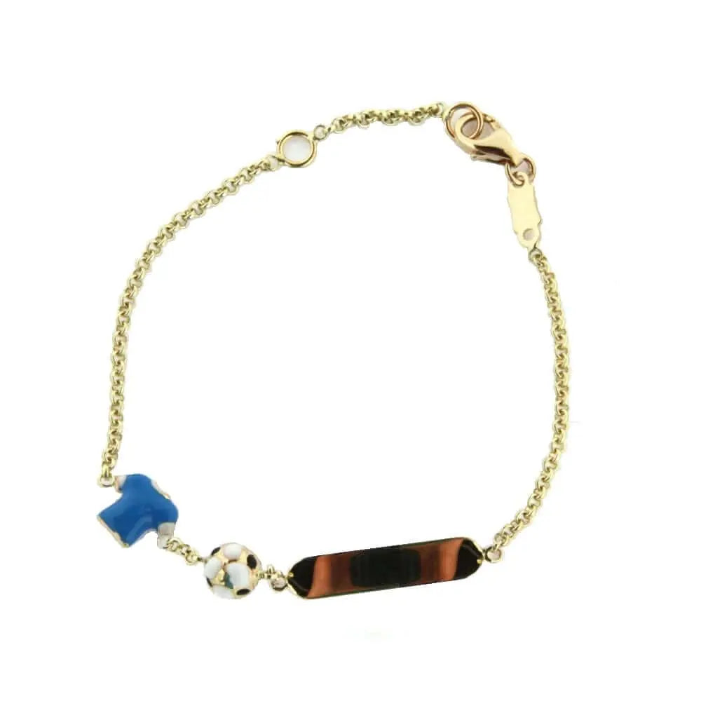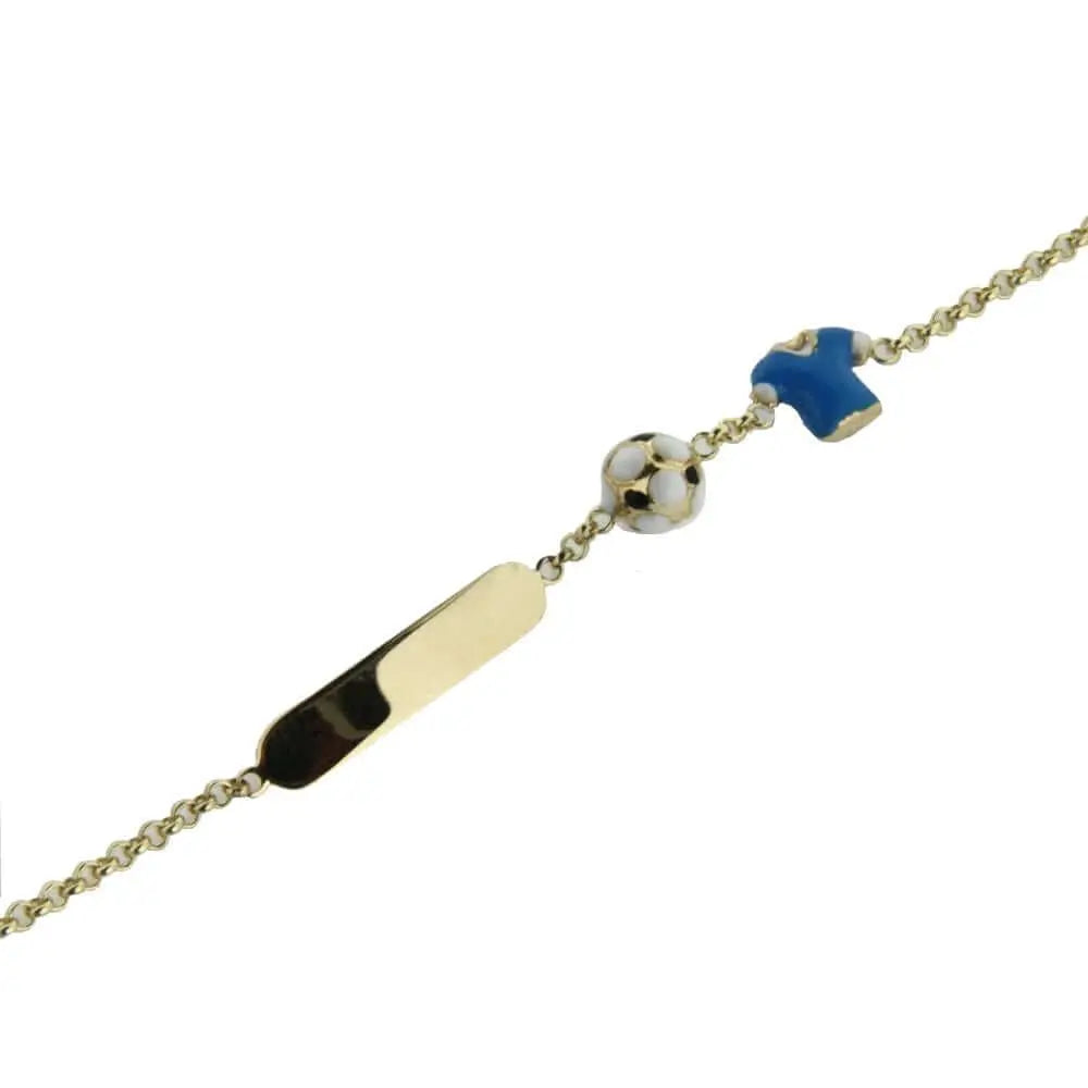 Discover the perfect accessory for young future soccer enthusiasts with our 18K Solid Yellow Gold Soccer Ball and Jersey ID Bracelet. Crafted in Italy from hypoallergenic 18K yellow gold, this exquisite bracelet features an enamel soccer ball and a charming blue shirt charm, capturing the spirit of the game. Designed for ages 0 to 5 years old, the bracelet measures 5.6 inches and includes an extra ring at 4.8 inches for an adjustable fit as your child grows. Presented in an elegant Amalia blue gift box, this bracelet makes for a thoughtful and enduring keepsake.