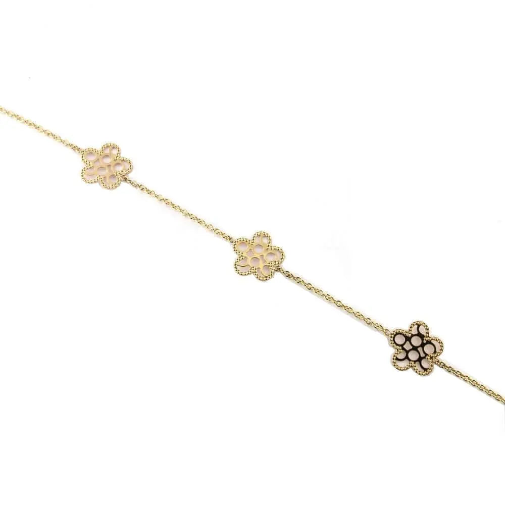 18K Yellow Gold with three open flowers bracelet 7 inches with extra rings starting at 6 inches