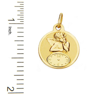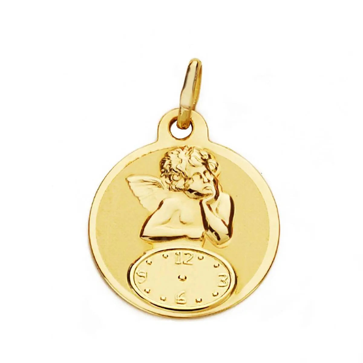 Discover our unique 18K Solid Yellow Gold Angel with Round Clock Medal, perfect for commemorating a baby's birth. Customize it with a mark or diamond for the birth hour and engrave the back with the date or baby's name. Hypoallergenic, 0.59 inches in diameter, and comes with an Amalia gift box and bag, making it an ideal keepsake.