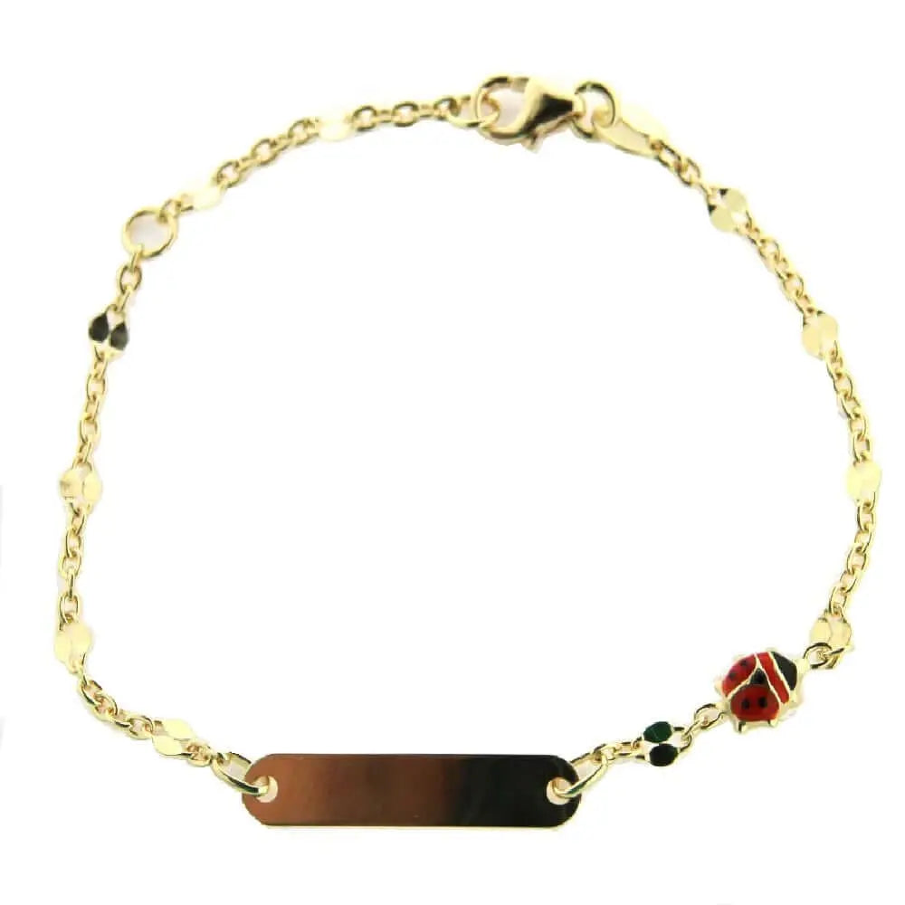 Elevate your little one's style with our charming 18K Yellow Gold Red Enamel Ladybug ID Bracelet, crafted with care in Italy. Hypoallergenic and adorned with lead-free enamel, it's gentle on delicate skin. Add a personal touch with optional engraving. Each bracelet comes with an elegant gift bag and box, making it a perfect present for any occasion.