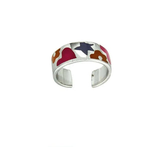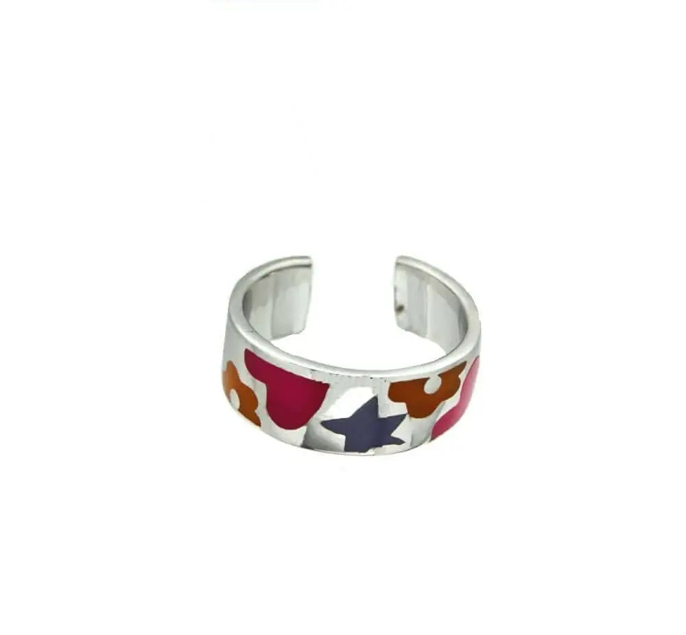 Add a touch of color and creativity to your jewelry collection with the Sterling Silver Enamel Star Hear and Flowers Open Ring — a playful statement of modern style and joyful design. Crafted in Spain by a famous Spanish jewelry designer, this adjustable ring celebrates fun expression through its mix of colorful enamel icons — a soft pink heart, lilac star, and cheerful yellow and purple flowers — all set against polished sterling silver for a radiant finish.