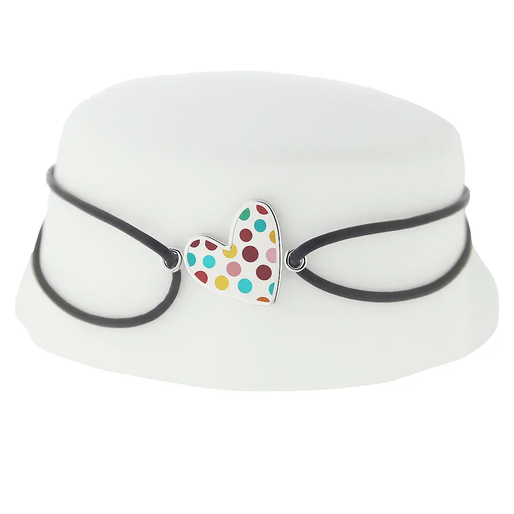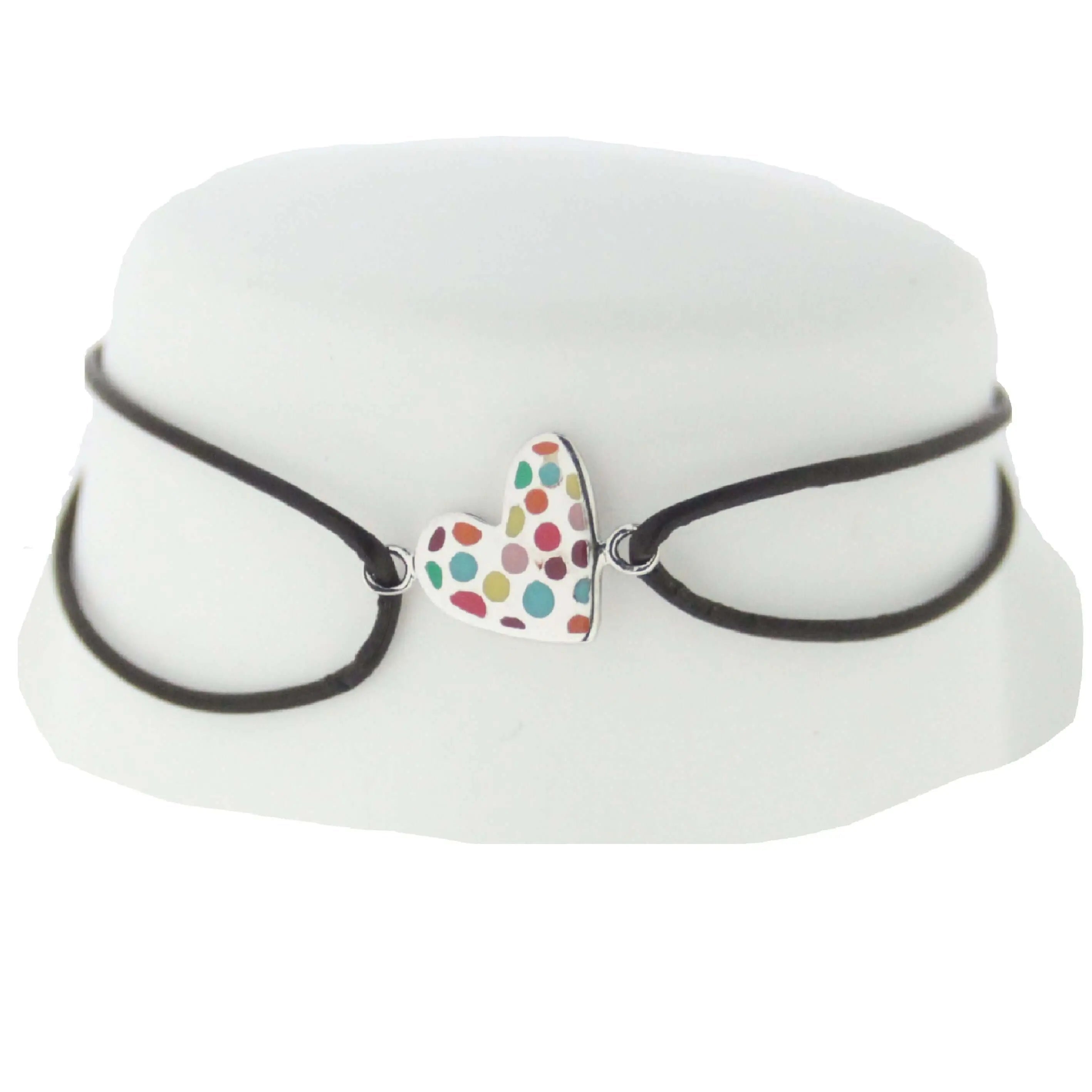 Surprise her with a stylish gift - our Sterling Silver Heart multicolor dots enamel Heart cord bracelet . Designed for teenagers aged 13 years old and up, this bracelet features a heart-shaped design adorned with polished enamel dots in vibrant colors, paired with a chic brown cord. Measuring 8 inches with adjustable rings starting at 6.50 inches, it ensures a comfortable and personalized fit.