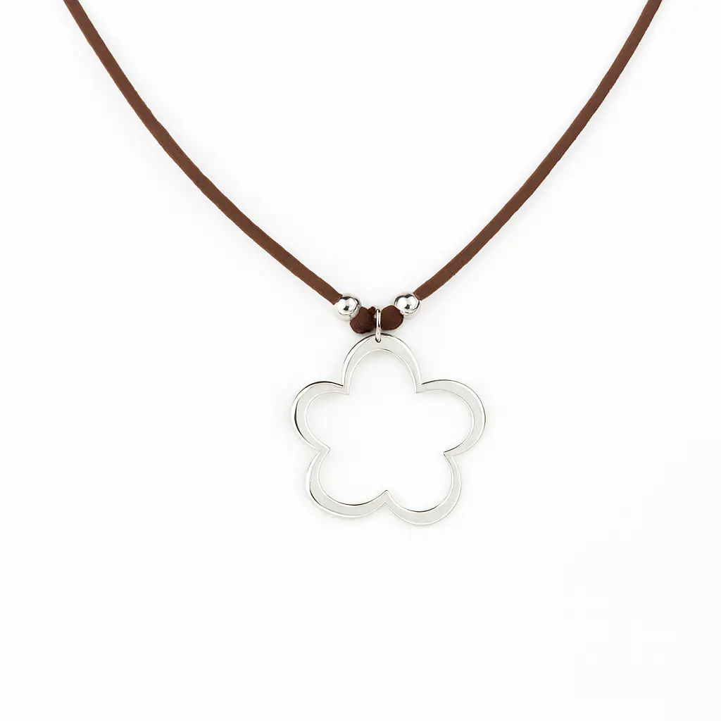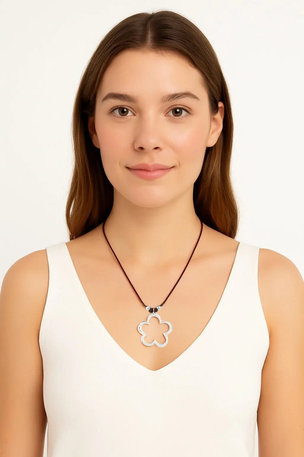 Featuring a durable brown cord measuring 20 inches, this necklace is both comfortable and versatile. At its center is a beautifully crafted sterling silver open flower pendant, measuring 1.58 x 1.52 inches. Its intricate design brings a touch of elegance and modernity, making it a standout accessory for casual and formal occasions.