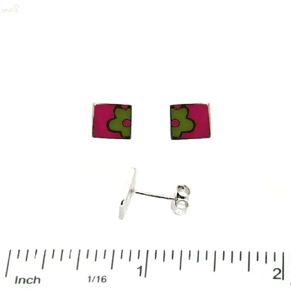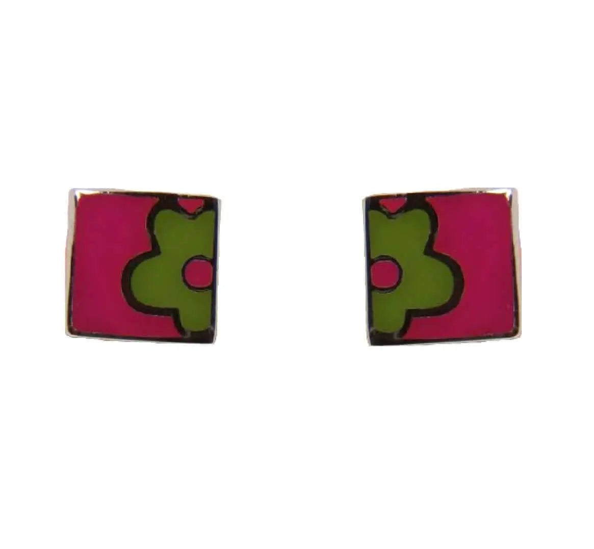 Add a vibrant touch to your look with the Sterling Silver Small Fuchsia and Green Flower Post Earrings. Designed in a charming square shape, these earrings feature a delicate green flower set against a bold fuchsia background, creating a striking combination of colors that’s perfect for teenagers aged 13 and up.