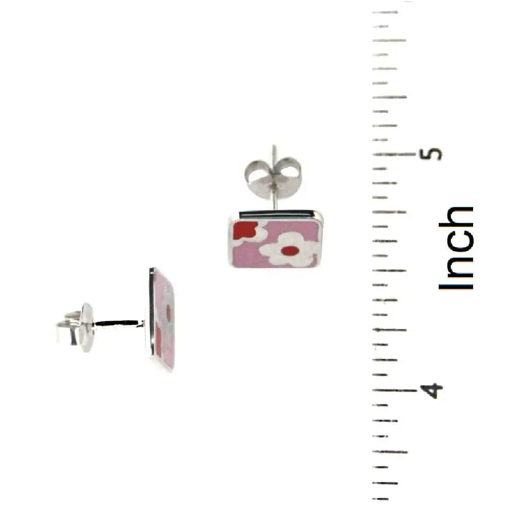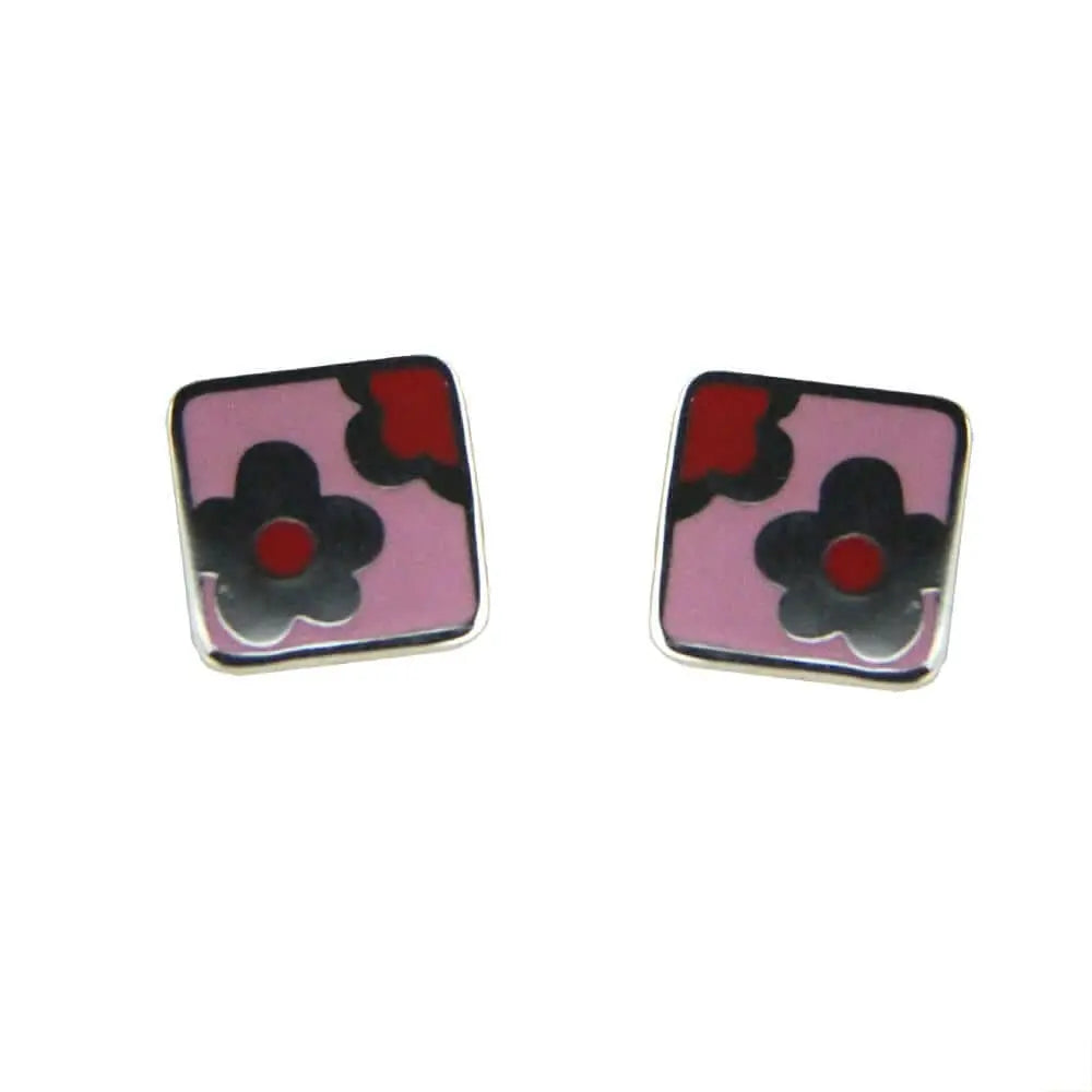 Sterling Silver Square Pink and Red Enamel Polished Flowers Post Earrings.